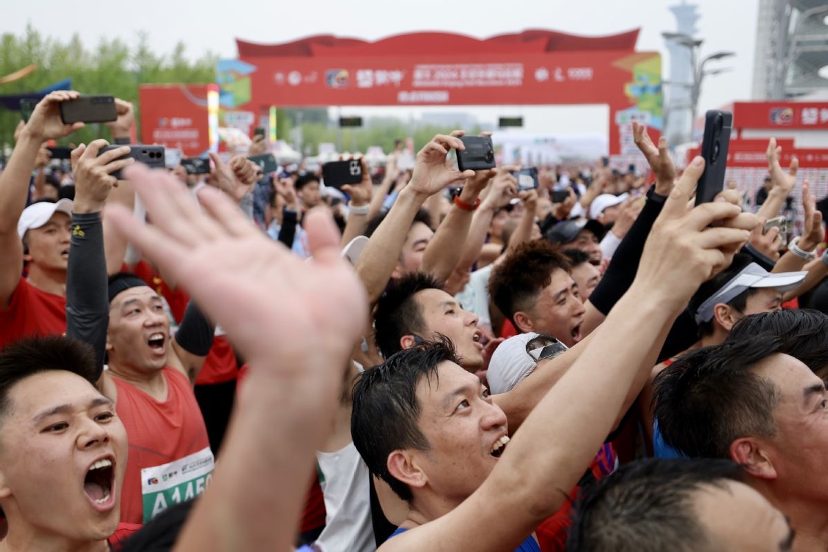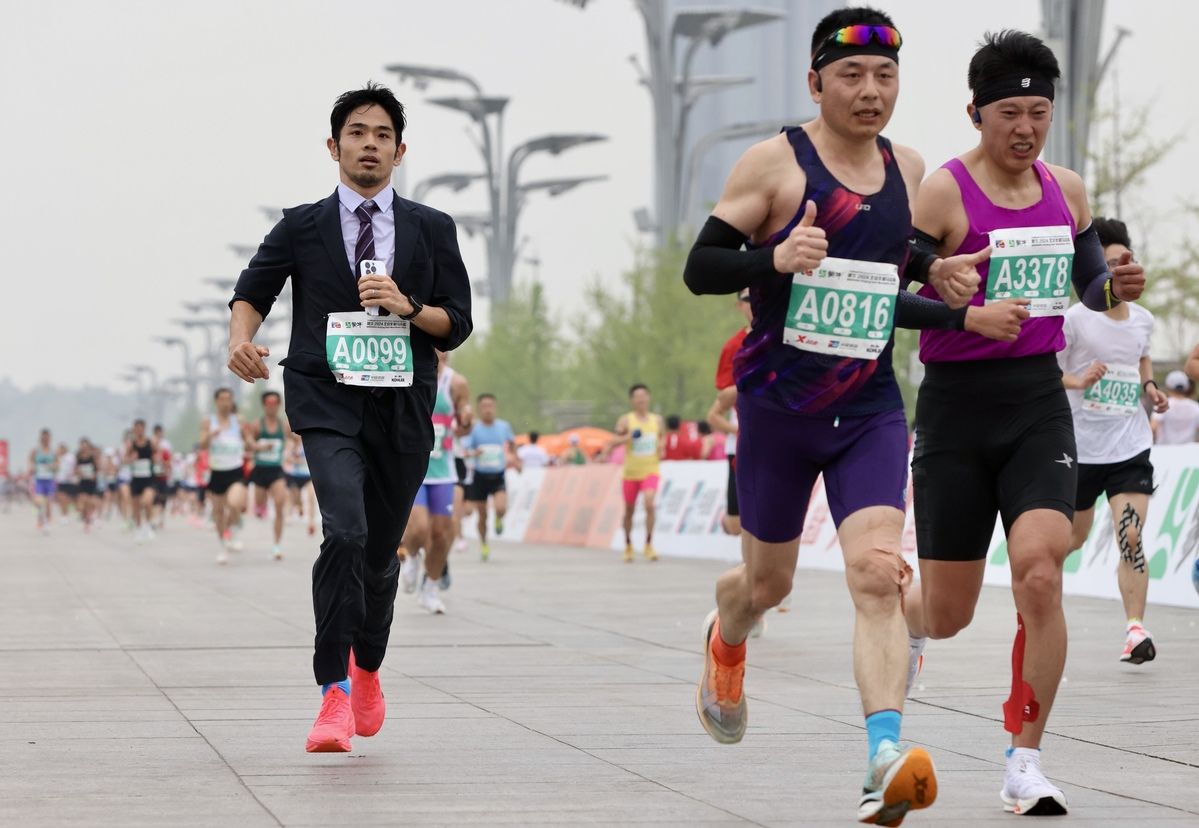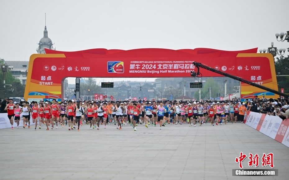 4月14日,2024年北京半程马拉松赛鸣枪开跑,比赛起点为北京天安门广场,终点为奥林匹克公园中心区庆典广场,竞赛规模为2万人。经过一个多小时的争夺,男子组的何杰以1小时03分44秒获得男子组冠军。女子组冠军为刘敏,成绩是1小时11分12秒。图为参赛选手从天安门广场起跑。新华社