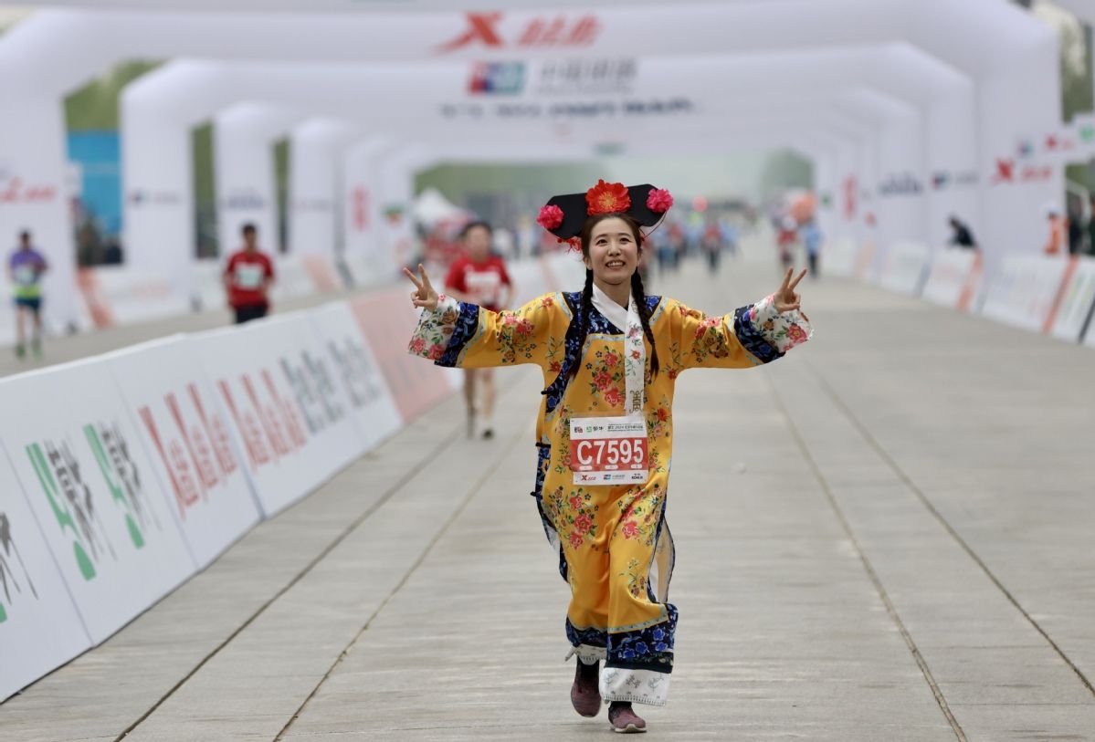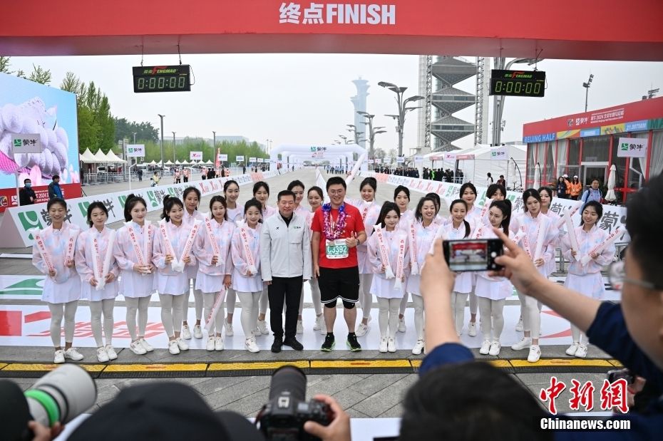 最后一名参赛选手抵达终点,获颁花环。中新网