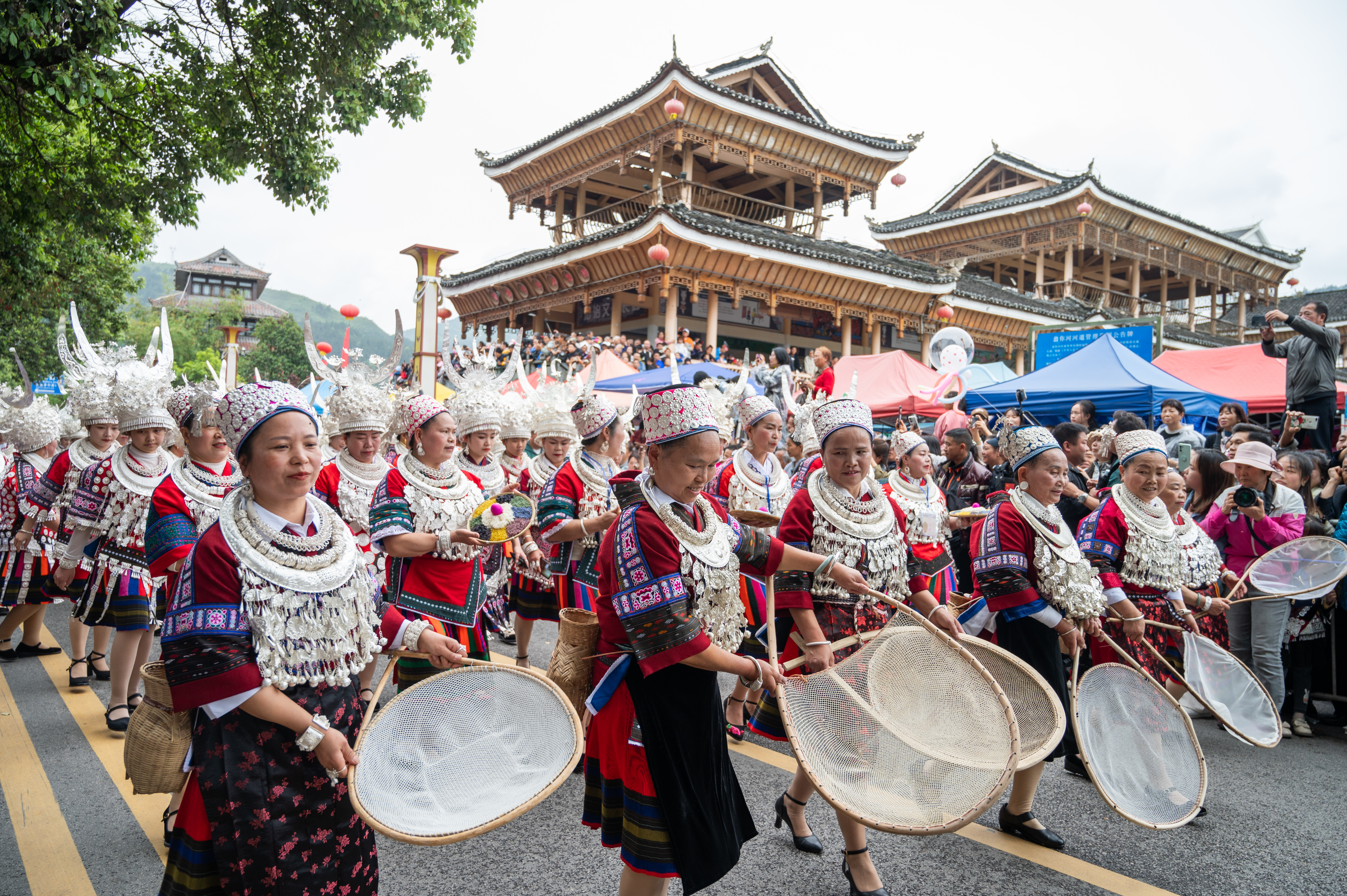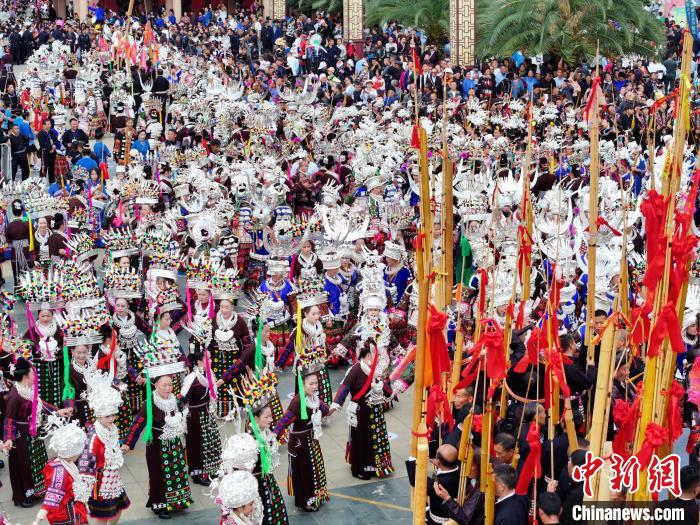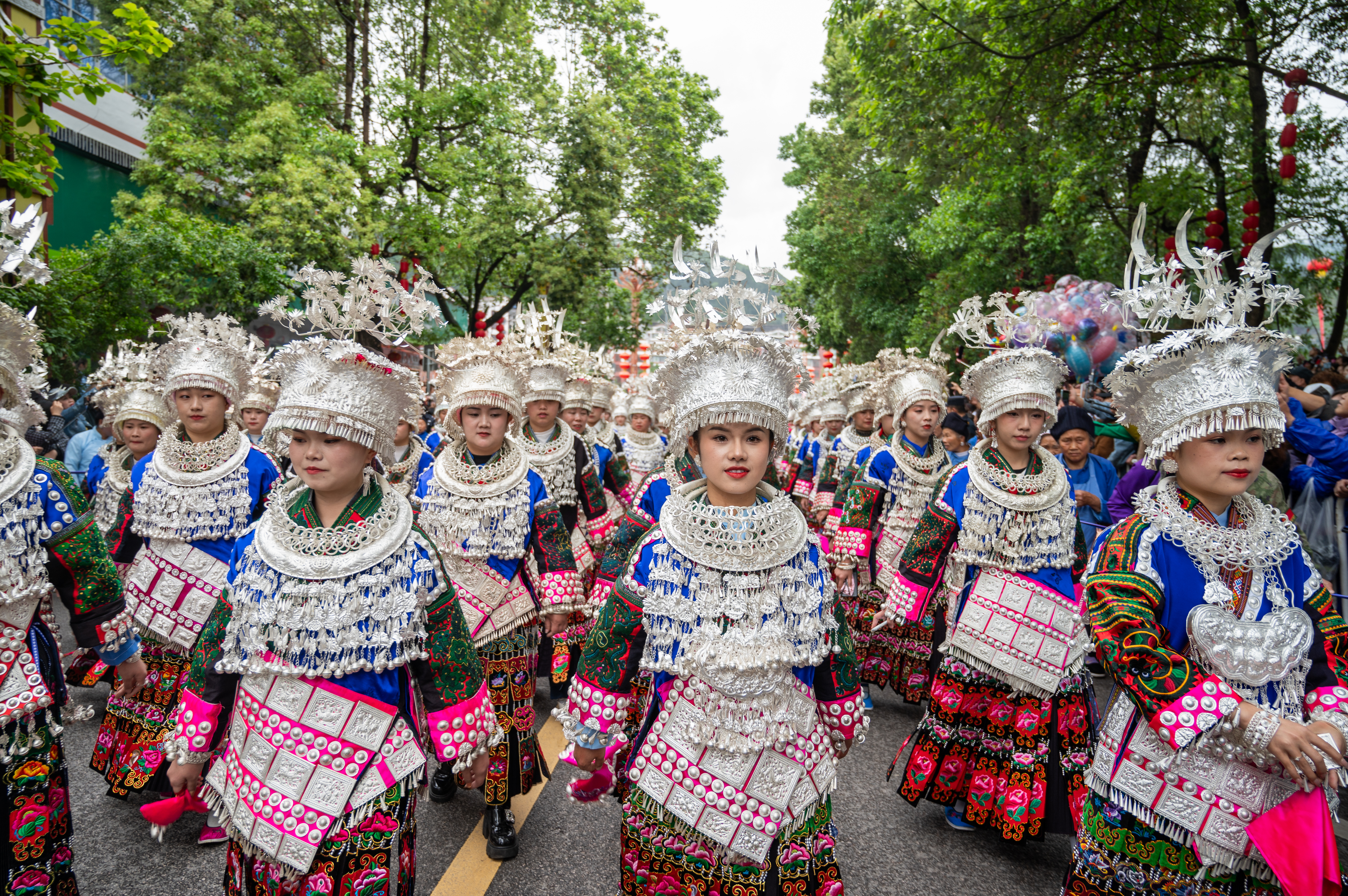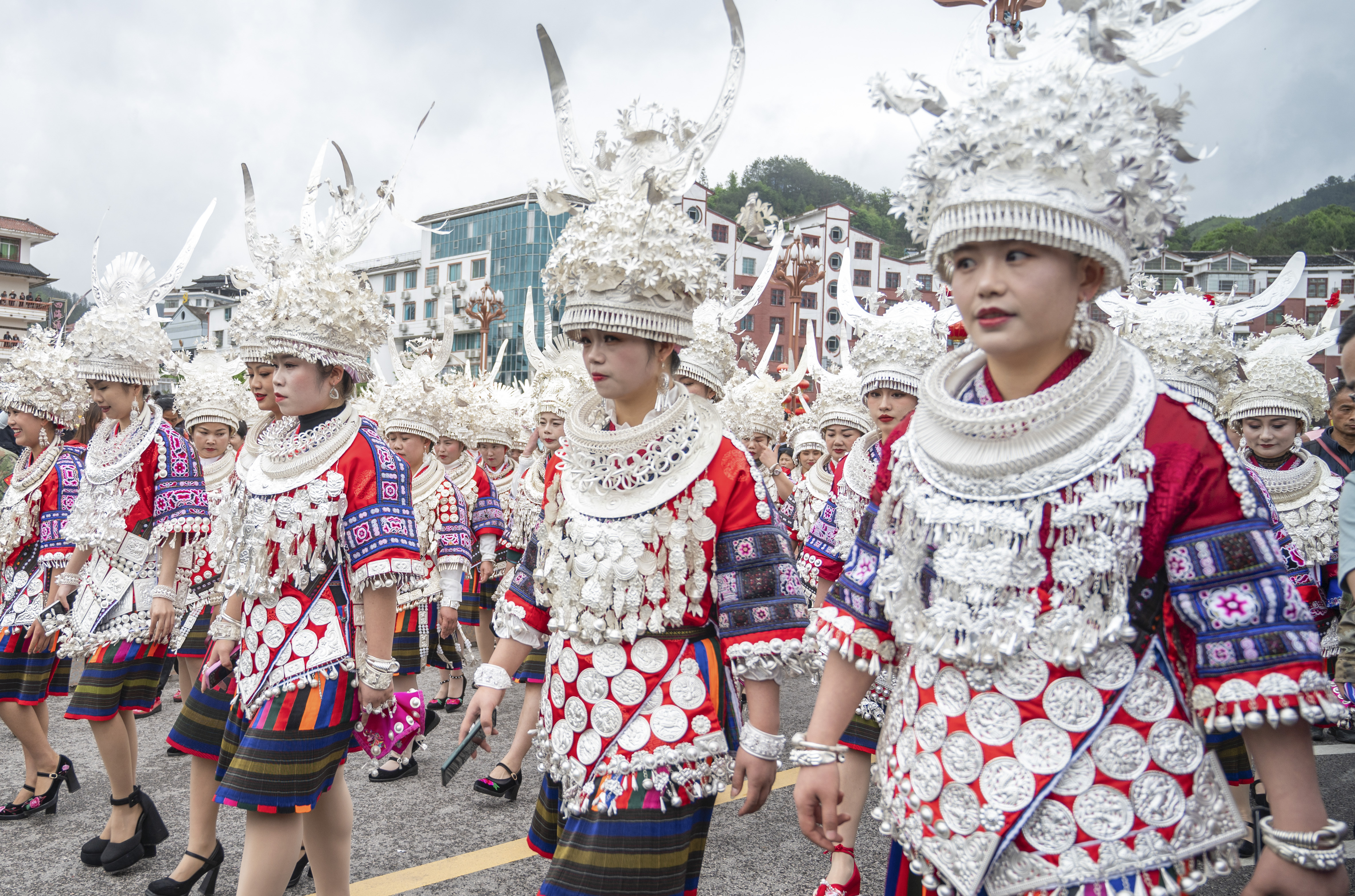4月21日,2024年苗族姊妹节盛装巡游活动在贵州省黔东南苗族侗族自治州台江县举行。图为穿着苗族盛装的巡游队伍。中新社
