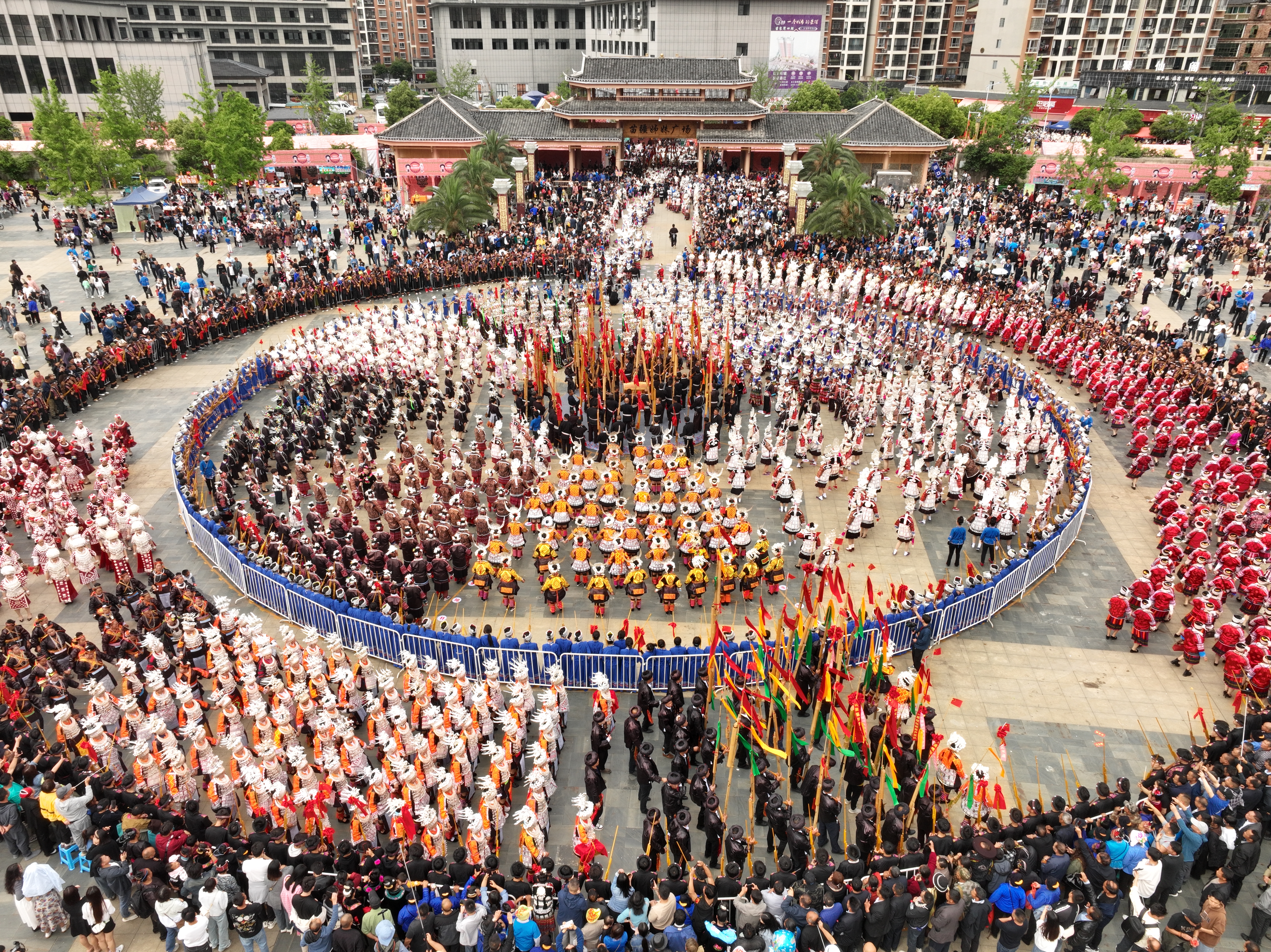 4月21日,航拍穿着苗族盛装的巡游队伍。中新网