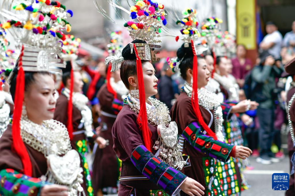4月21日,穿着苗族盛装的巡游队伍。中新社