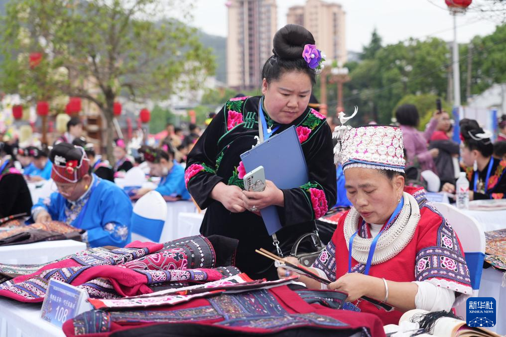 4月21日,苗族妇女在台江县参加苗族刺绣大赛。新华社