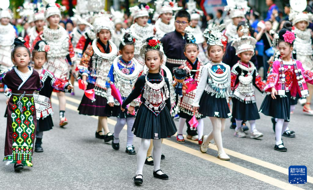 4月21日,苗族小朋友参加台江苗族姊妹节盛装游演。新华社