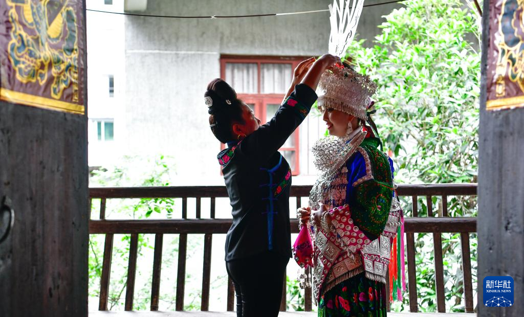 4月21日,在贵州省台江县,一名苗族母亲帮助女儿穿戴苗族银饰,准备参加苗族姊妹节盛装游演。新华社