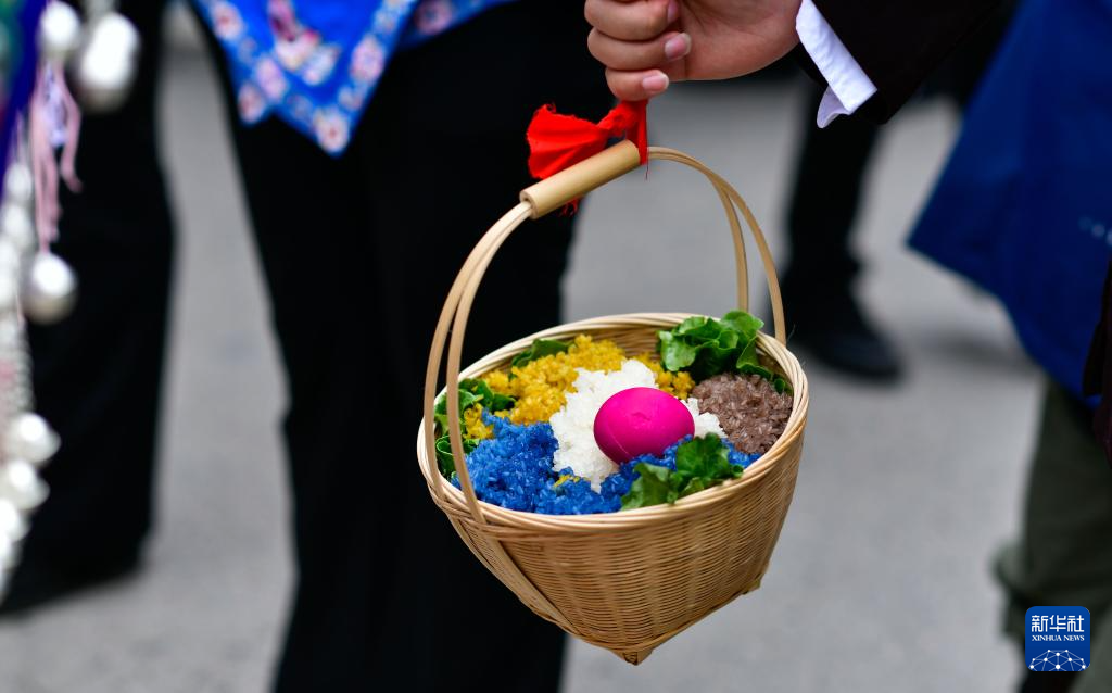 4月21日,苗族民众挑着姊妹饭和鸡蛋参加苗族姊妹节盛装游演。新华社