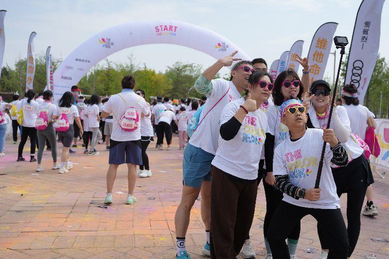 4月20日,2024 The Color Run 北京站(彩色跑)活动在北京园博园举行,活动持续一整日。据悉,足迹遍布全球200多个城市、吸引800多万人参与的彩色跑,可谓是全球运动爱好者的派对。图为当日,在The Color Run 北京站(彩色跑)起跑处,一个晨跑团自拍合影。苏楠/摄