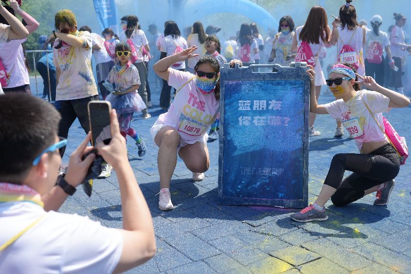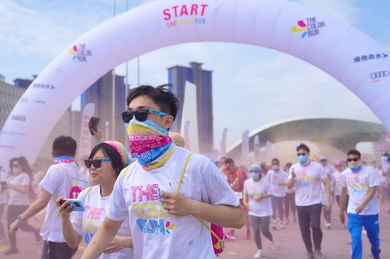 4月20日,在这场“世界上最快乐的5公里”中,“彩粉儿”们穿着白色T恤出发,路上每一公里都设有一个彩色站点,每经一个彩色站,人们都会被一种新的色彩覆盖。最终,参加活动的人群变成一片色彩的海洋。苏楠/摄