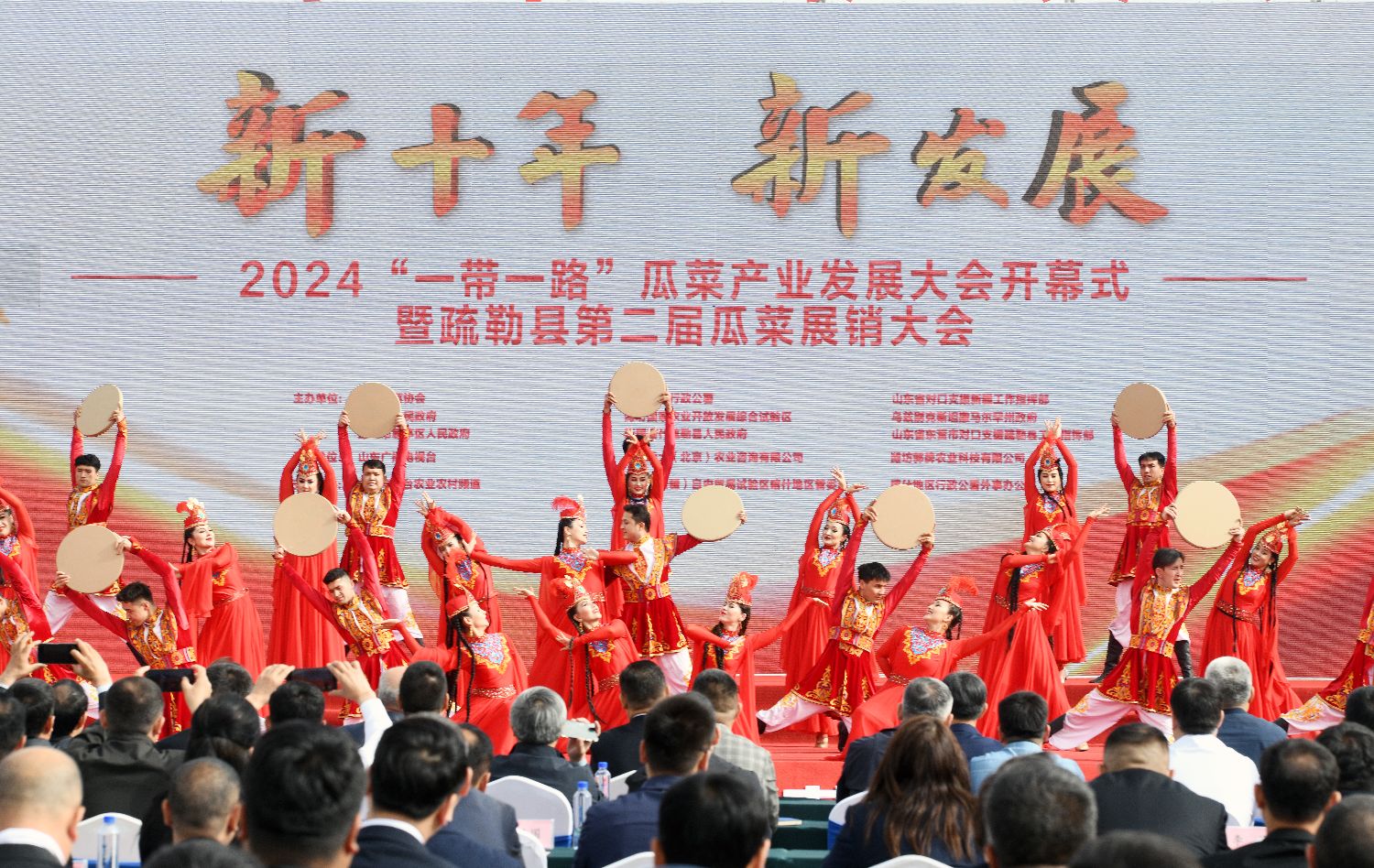 2024年是“一带一路”倡议提出的新十年的开端。为服务“一带一路”倡议,加快推动共建国家瓜菜产业领域合作交流,实现“一带一路”合作伙伴农业科技创新持续发展,中国蔬菜协会、喀什地区行政公署、山东省对口支援新疆工作指挥部、东营市人民政府、潍坊国家农业开放发展综合试验区、乌兹别克斯坦撒马尔罕州政府、潍坊市寒亭区人民政府、新疆喀什疏勒县人民政府、山东省东营市对口支援疏勒县工作指挥部等单位联合举办2024“一带一路”瓜菜产业发展大会。图为开幕式表演。咸宁新闻网