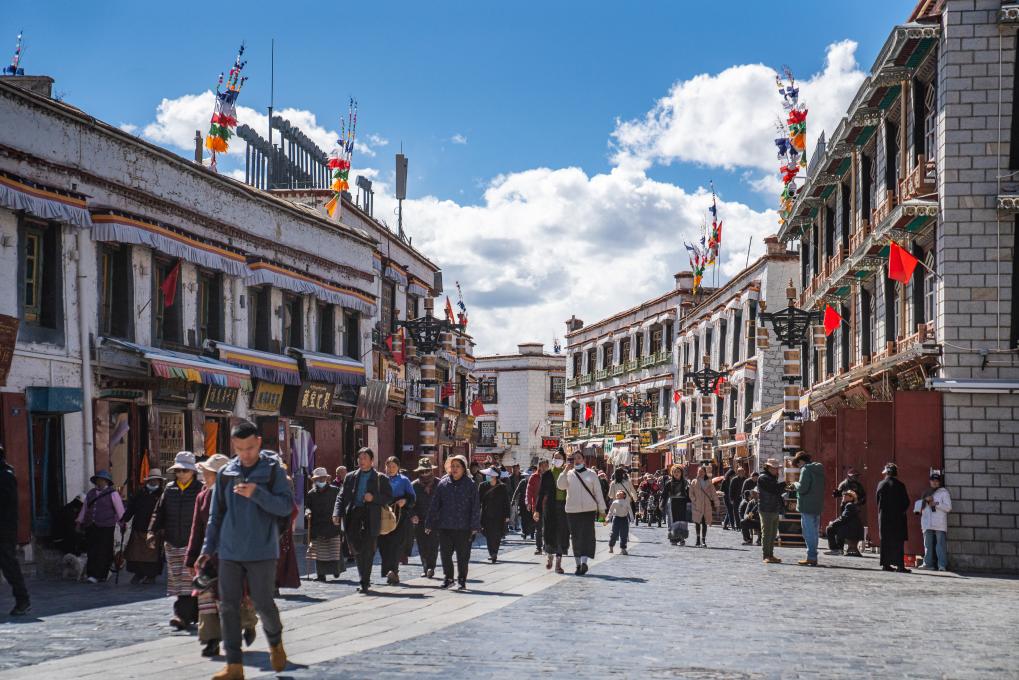 近日,随着西藏旅游旺季的临近,前往雪域高原观光旅游的海内外游客日渐增多,旅游市场人气攀升。图为4月23日,身着藏装的游客在拉萨八廓街拍照留念。中新社