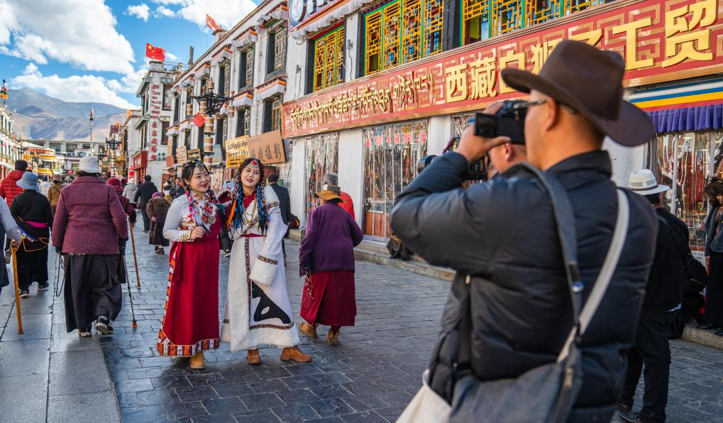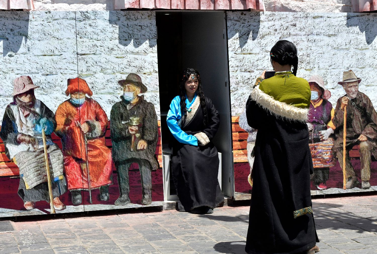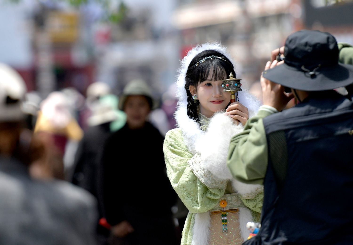 4月23日,身着藏装的游客在拉萨八廓街拍照留念。中新社