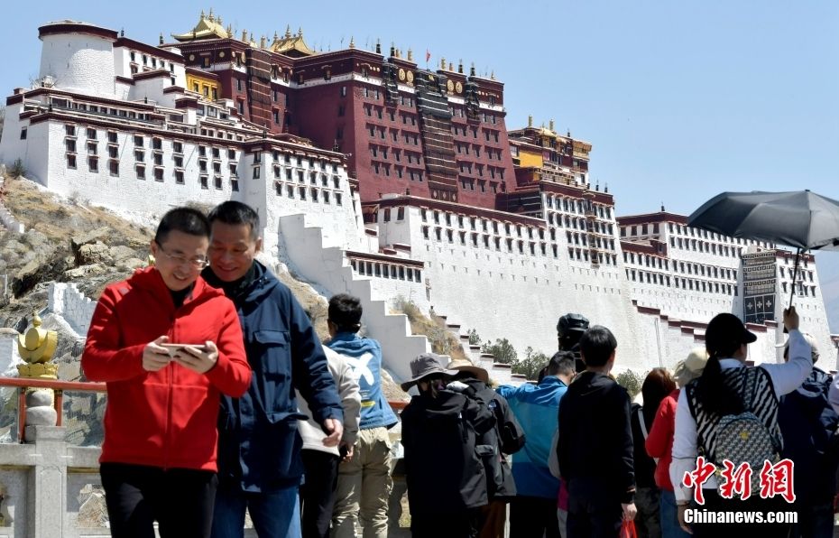 4月23日,游客在拉萨药王山观景台拍照留念。中新网