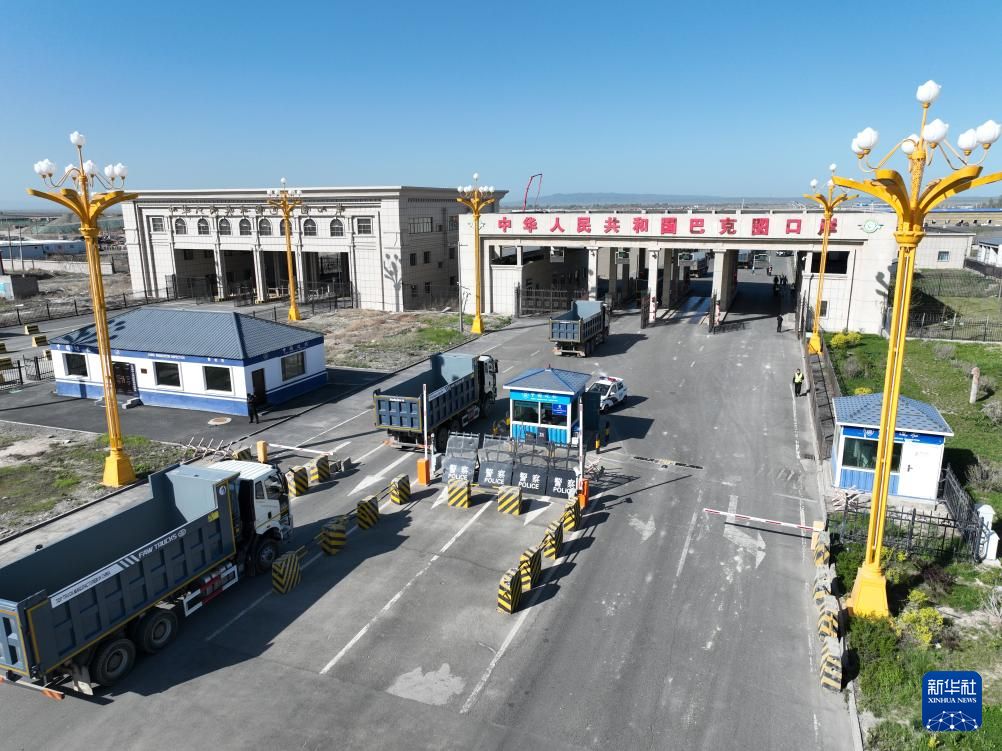 4月以来,巴克图口岸出口量不断攀升,单日通关峰值达398辆。图为4月23日,车辆在巴克图口岸执勤民警引导下有序出境(无人机照片)。新华社