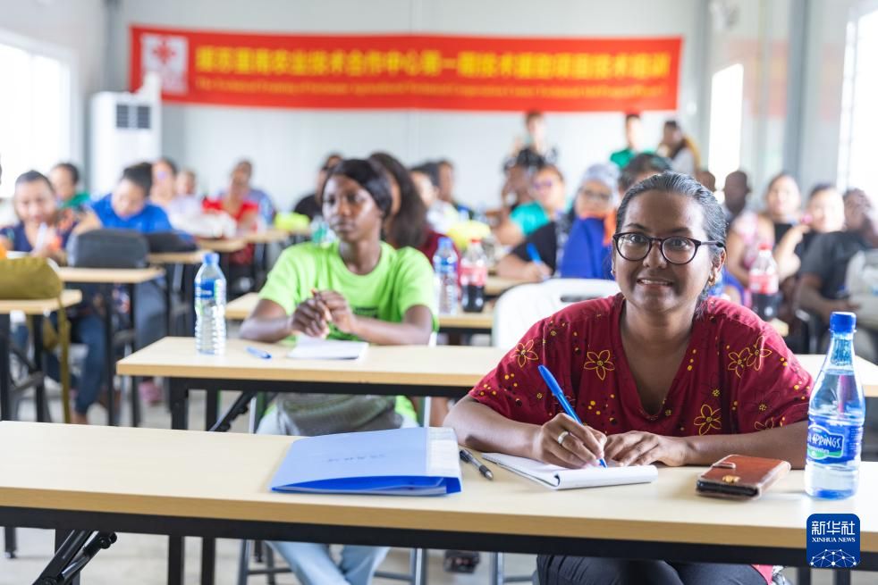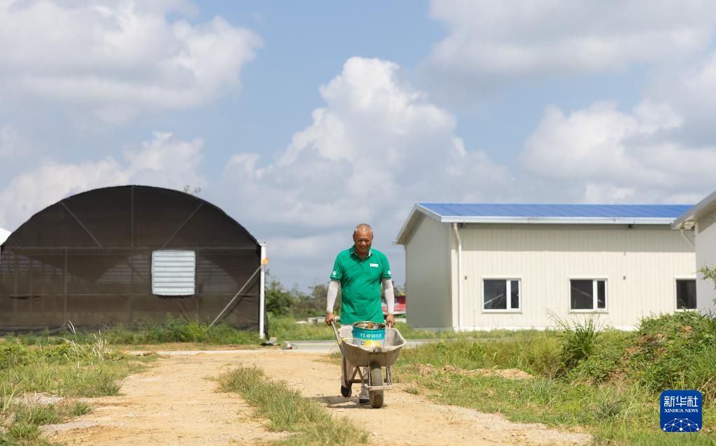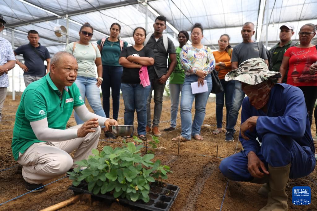 中国援苏里南农业技术合作中心技术援助项目于2022年启动。该项目计划举办10期集中培训班,目前进行到第三期。中方派遣相关专家赴苏开展农作物引种、选育、繁育、栽培等试验以及农业技术培训与推广,帮助当地学员了解中国农业新技术、新品种,掌握实用农业种植技术,培养学员的现代化农业管理理念,逐步提高苏里南农业技术科技含量。图为4月3日,在位于苏里南萨拉马卡区的中国援苏里南农业技术合作中心,农业专家在大棚讲解秧苗移栽技术。