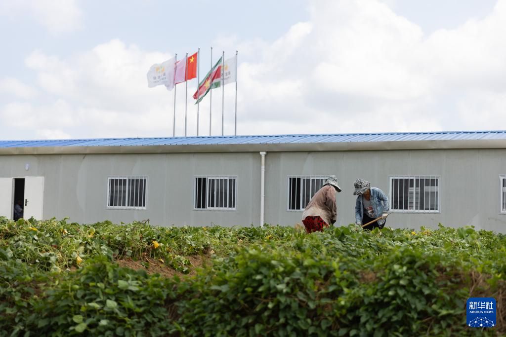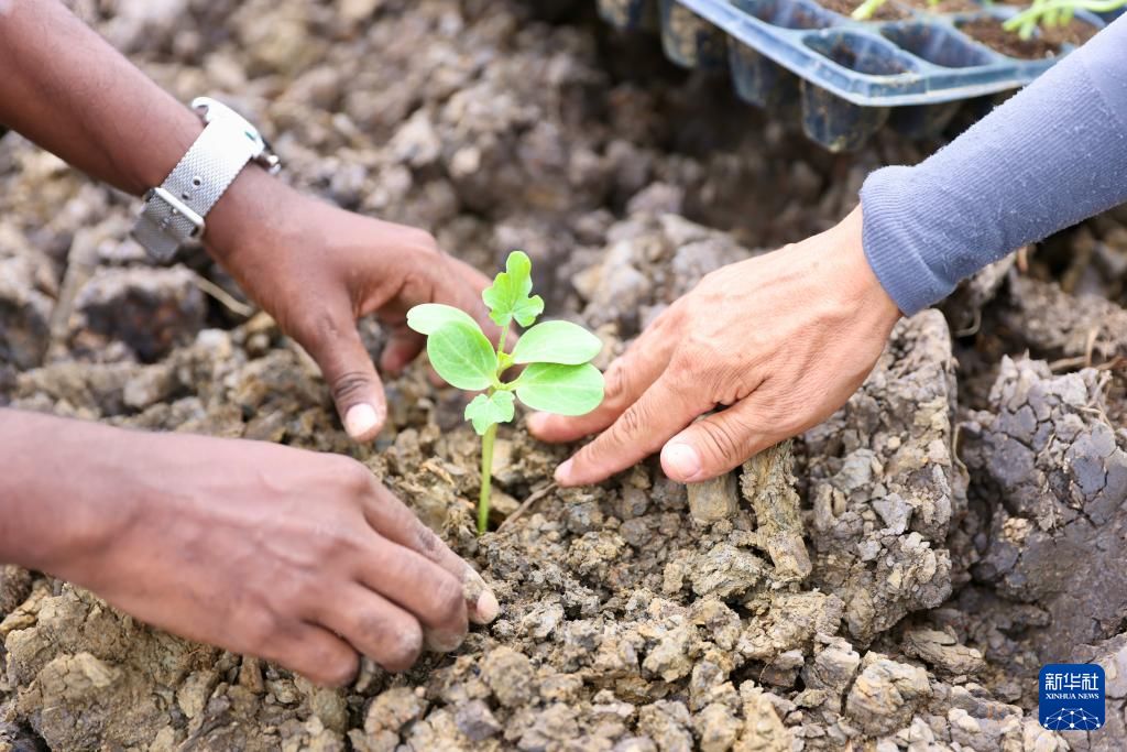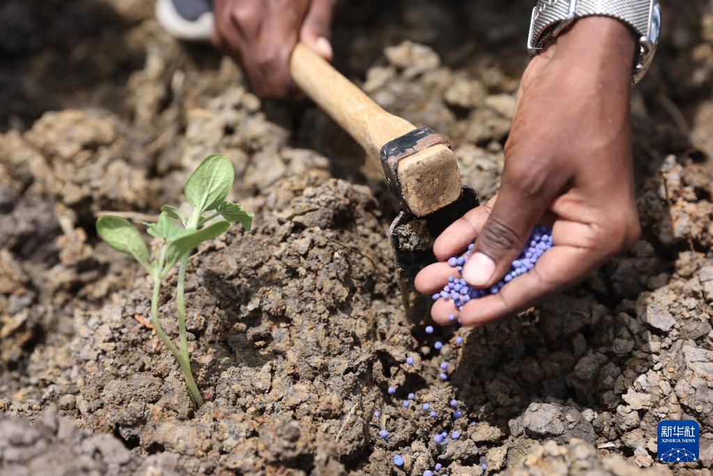 4月5日,中国农业技术专家与农户杜基一起,将西瓜秧苗移栽到地里并施肥。