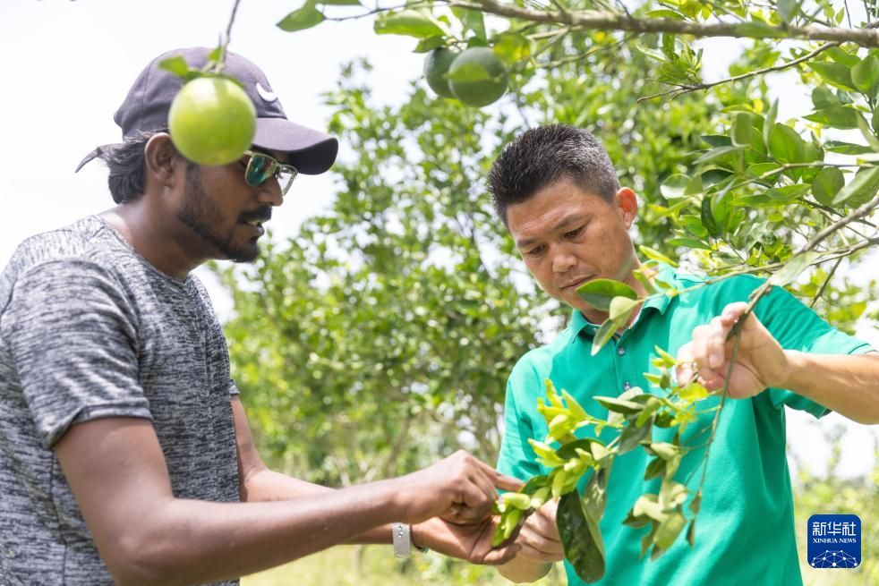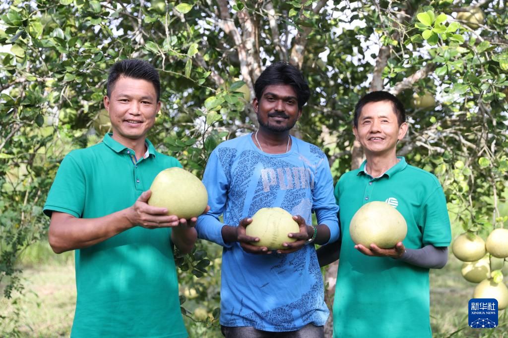 阿什温·杜基是苏里南萨拉马卡区的一名青年农户,他也是中国援苏里南农业技术合作中心技术援助项目所帮扶的农户之一。从前,杜基家里经济困难,连买农具都要向亲朋好友借钱。如今,得益于中国专家带来的先进技术和优质种苗,杜基种植的作物产量翻了一番,年收入也增加了一倍。图为4月5日,在苏里南萨拉马卡区农户阿什温·杜基家的果园里,中国援苏里南农业技术合作中心的农艺师杜时云(左)、刘经国(右)与农户杜基合影。