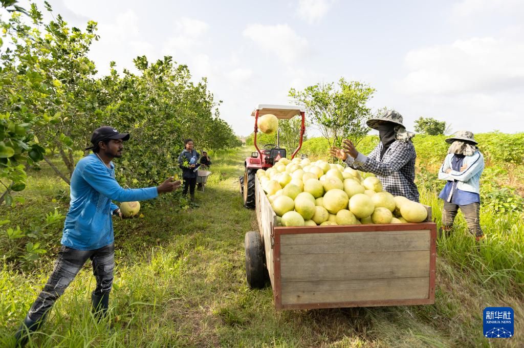 4月5日,在苏里南萨拉马卡区农户阿什温·杜基家的果园里,农户杜基(左一)在收获柚子。
