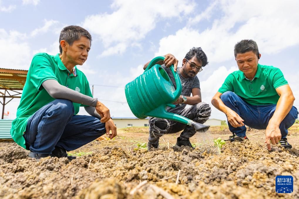 4月5日,中国援苏里南农业技术合作中心农艺师杜时云(右)、刘经国(左)与农户杜基一起,给刚移栽到地里的西瓜秧苗浇水。