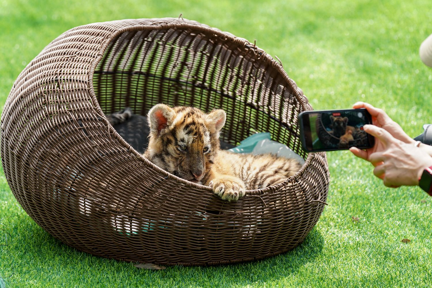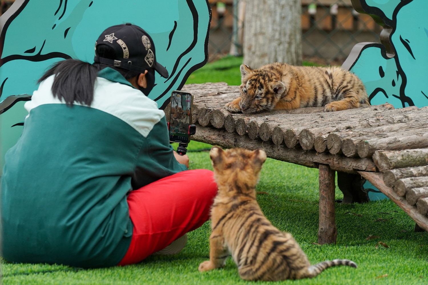 4月24日,两只两个多月的小东北虎在位于中国哈尔滨的黑龙江东北虎林园内萌虎乐园亮相。图为饲养员给小东北虎拍照。中新社