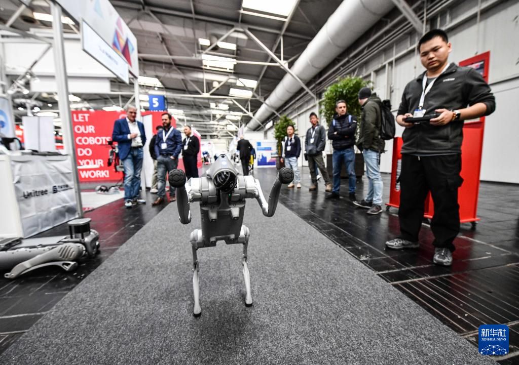 中国杭州宇树科技有限公司参展商(右一)在展示一款机器狗。