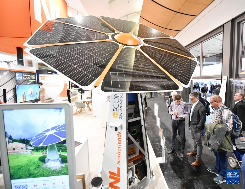 工博会上一款光伏设备。该设备可根据太阳位置调整面板角度。