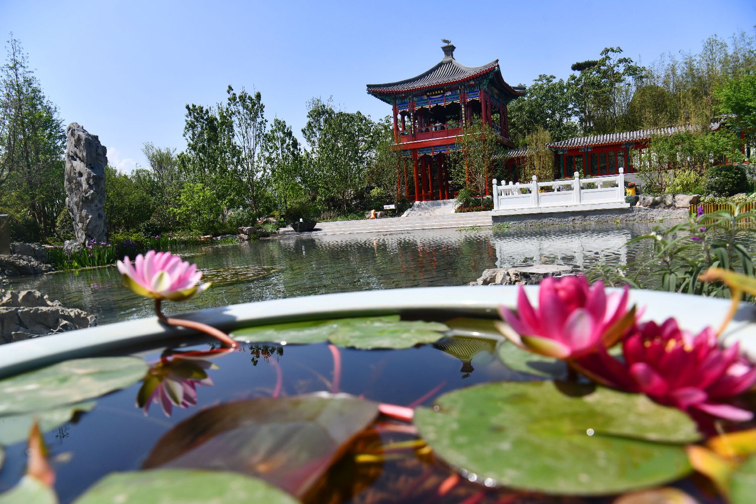 2024年成都世界园艺博览会于4月26日至10月28日举行,约800位海内外嘉宾共同见证盛会启幕。据了解,成都世园会采取“一主四辅”办会格局,包含1个主会场和4个分会场。主会场所在地成都东部新区,园区规划总面积3633亩。游客们将一睹五大洲奇珍异草同园竞放的盛景,共有60余种本地区植物和500余种展园特色植物集中呈现。此外,成都市温江区、郫都区、新津区、邛崃市四个分会场分别突出川派盆景、花卉产业、农艺博览、生物多样性特色,演绎人与自然和谐共生的生动图景。图为北京园。中新社
