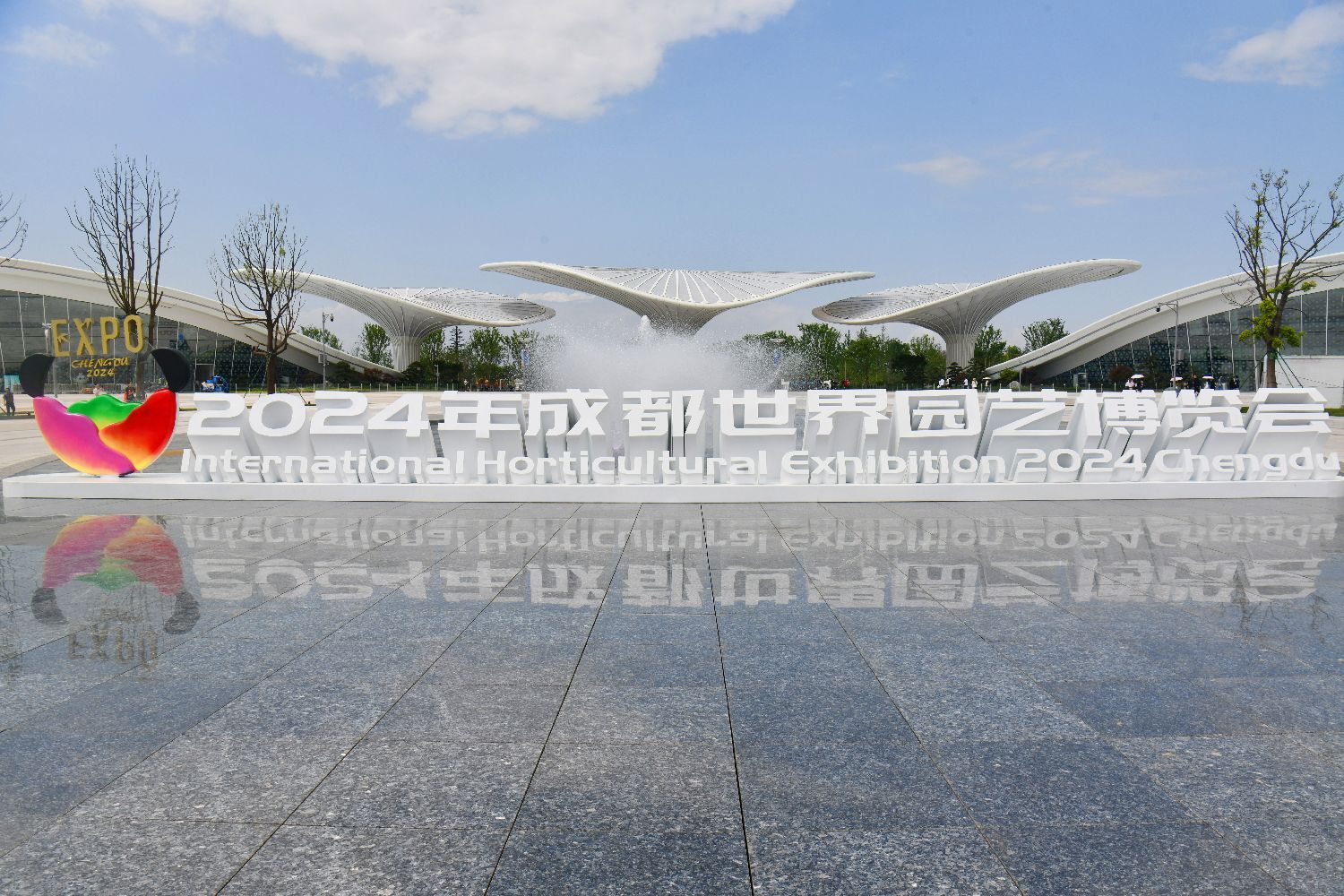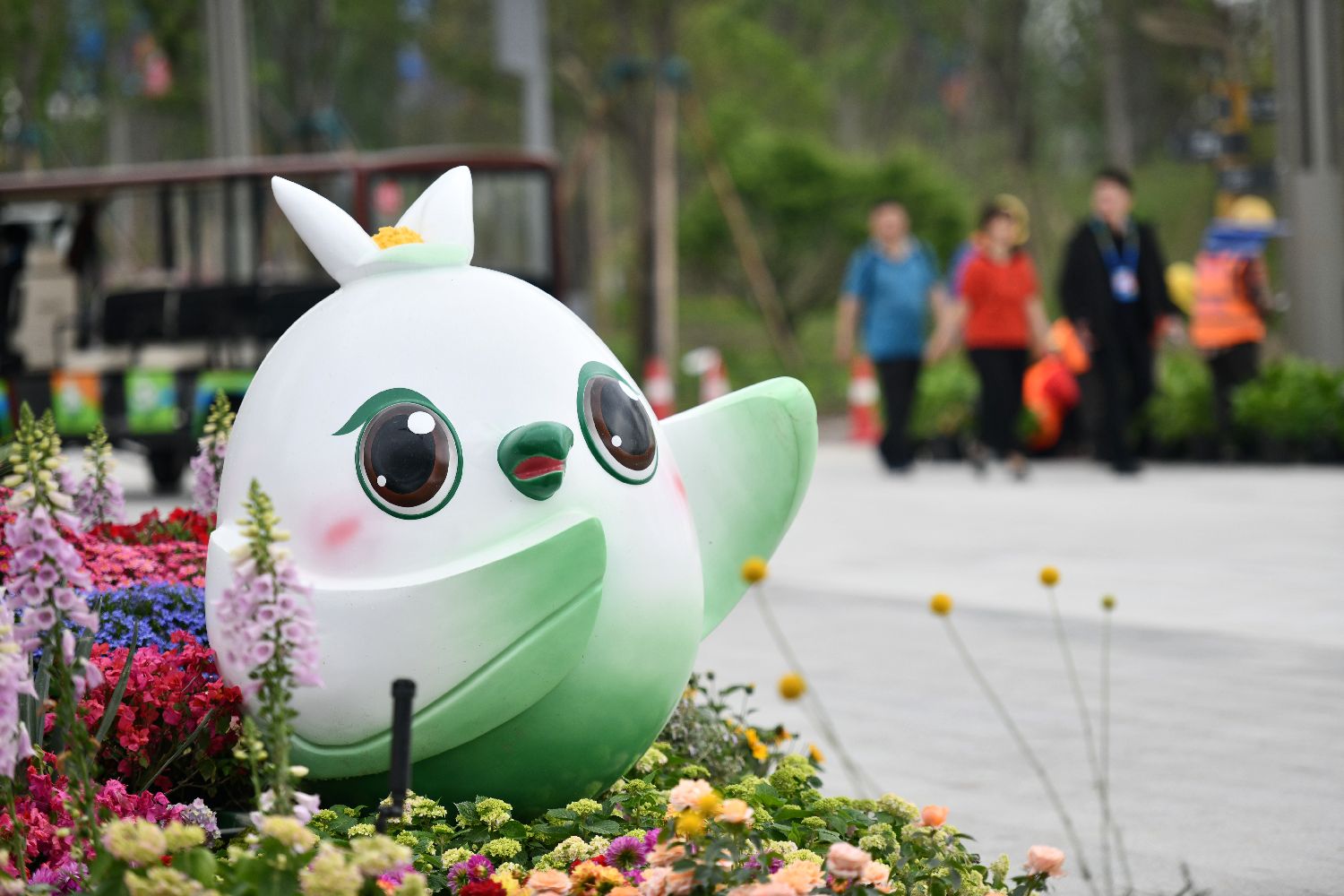 主会场入口处摆放的成都世园会吉祥物“桐妹儿”。中新社
