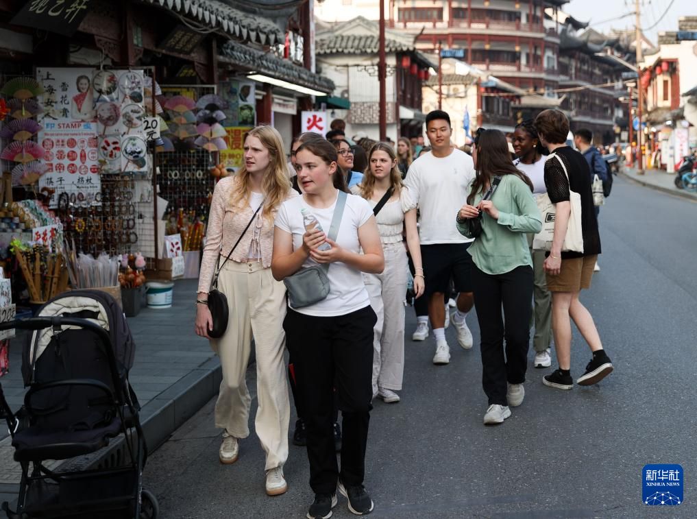 4月17日,美国马斯卡廷中学“友谊传承”研学团抵达北京,开启为期8天的研学之旅。这是今年第二批到中国交流学习的马斯卡廷中学生。图为4月23日,马斯卡廷中学“友谊传承”研学团学生经过上海豫园附近一条街道。新华社