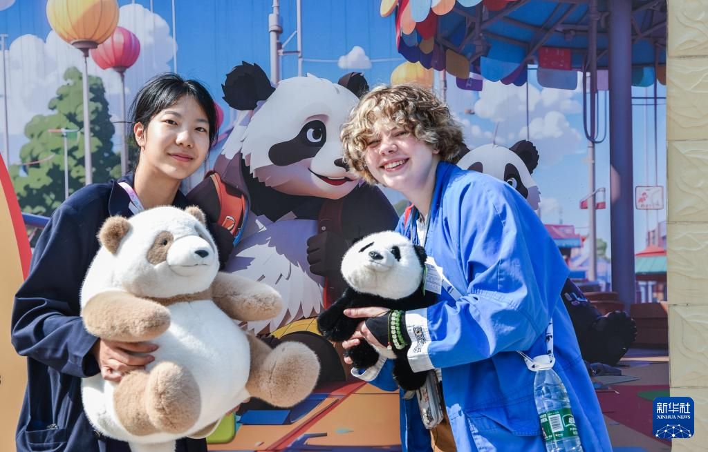 4月21日,中美学生在石家庄动物园大熊猫馆内手持熊猫玩偶留影。新华社