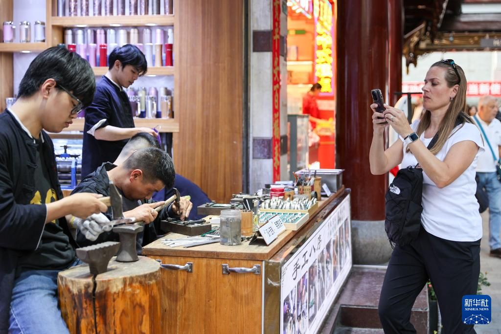 4月23日,马斯卡廷中学“友谊传承”研学团老师(右)在上海豫园商城观看打银器。新华社