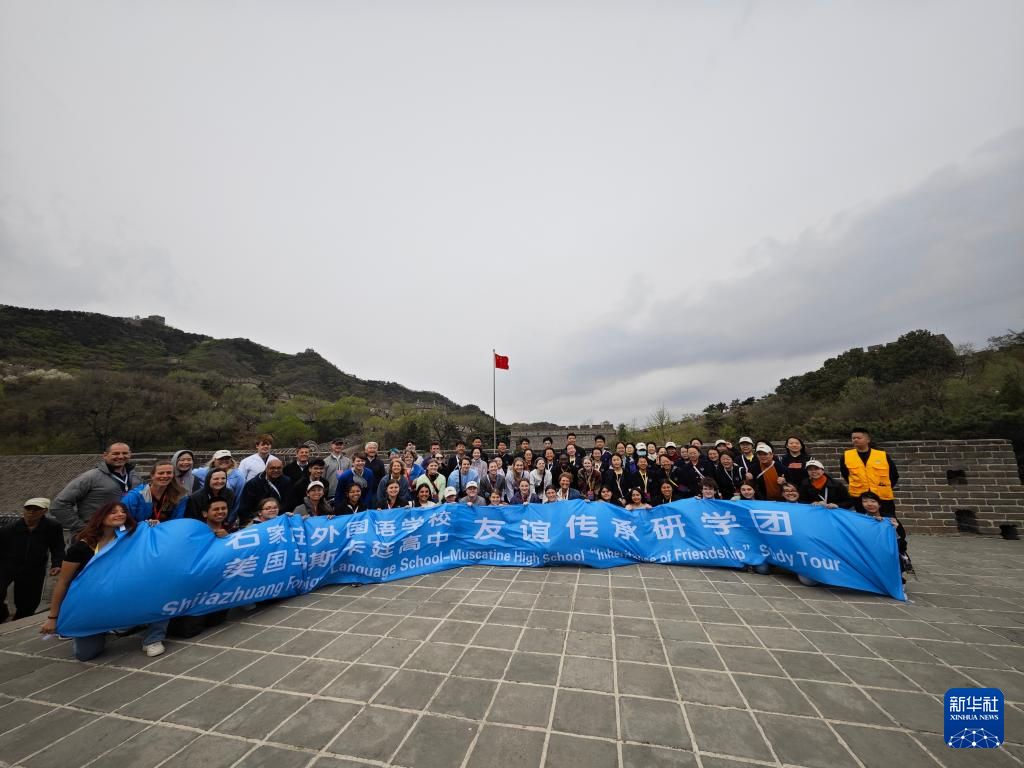 4月19日,马斯卡廷中学师生与石家庄外国语学校师生在北京八达岭长城上合影。新华社