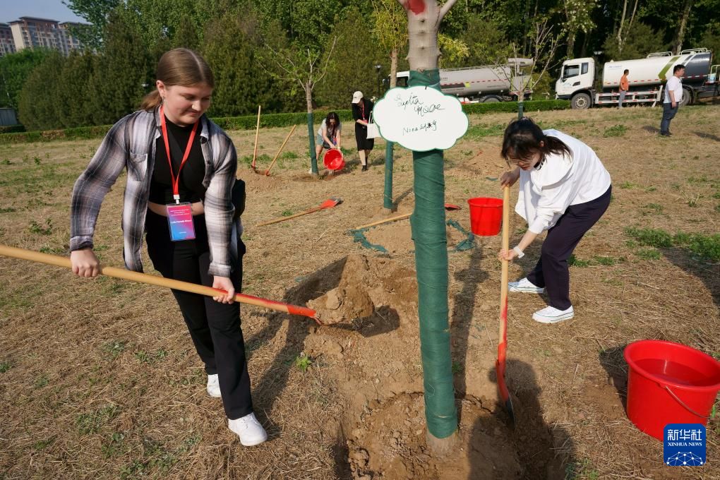 4月20日,美国马斯卡廷中学学生与石家庄外国语学校学生在河北正定的“中美友谊传承青年林”共同植树。新华社