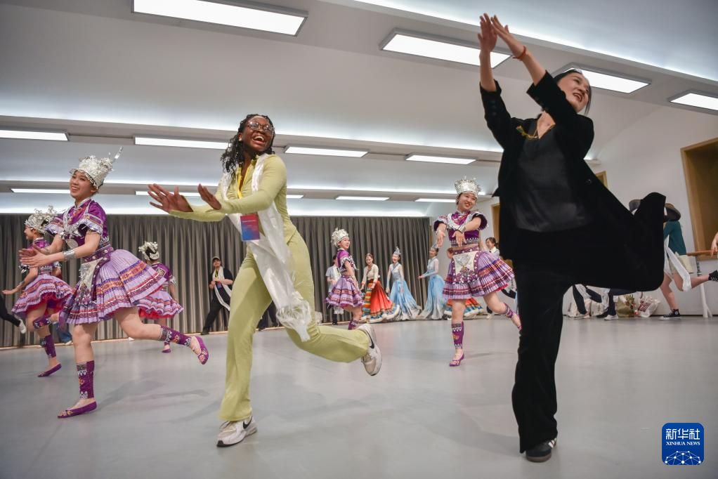 4月18日,马斯卡廷中学“友谊传承”研学团学生在北京师范大学附属中学与中国学生一同体验民族舞蹈。新华社