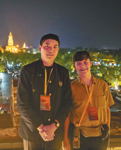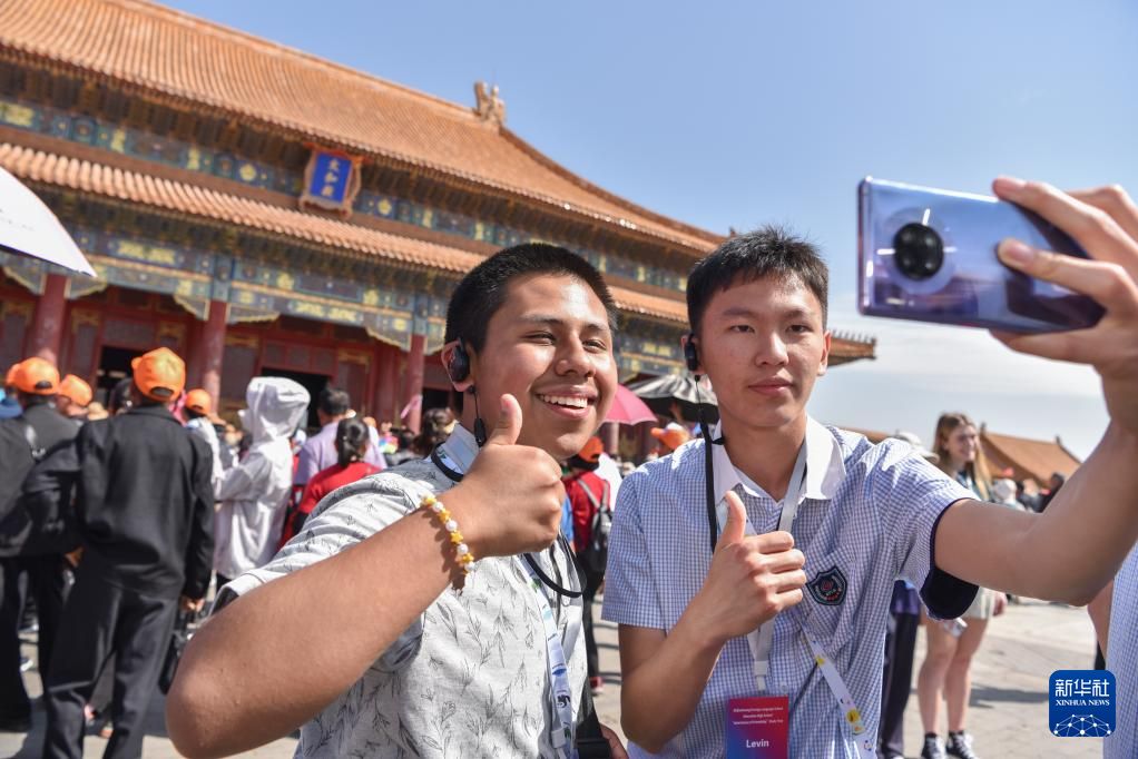 4月18日,马斯卡廷中学“友谊传承”研学团学生(左)在故宫留影。新华社