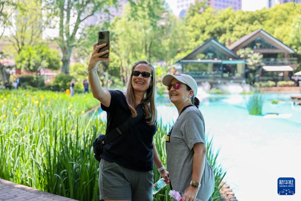 4月24日,马斯卡廷中学“友谊传承”研学团老师在上海静安公园留影。新华社