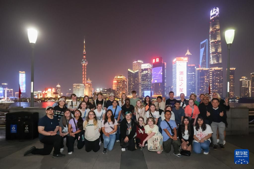4月23日,马斯卡廷中学“友谊传承”研学团师生在上海外滩合影。新华社