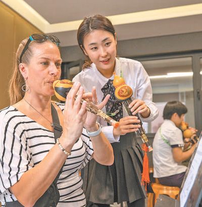 马斯卡廷中学教师(左)在石家庄外国语学校课堂上学习演奏葫芦丝。人民网