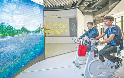 马斯卡廷中学学生(右)体验VR单车雄安新区城市漫游项目。人民网