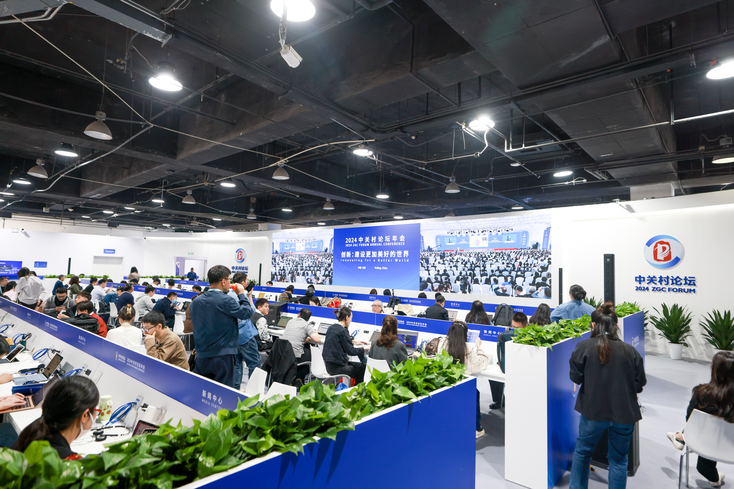 4月25日,媒体记者在中关村论坛新闻中心内观看开幕式直播。中新社