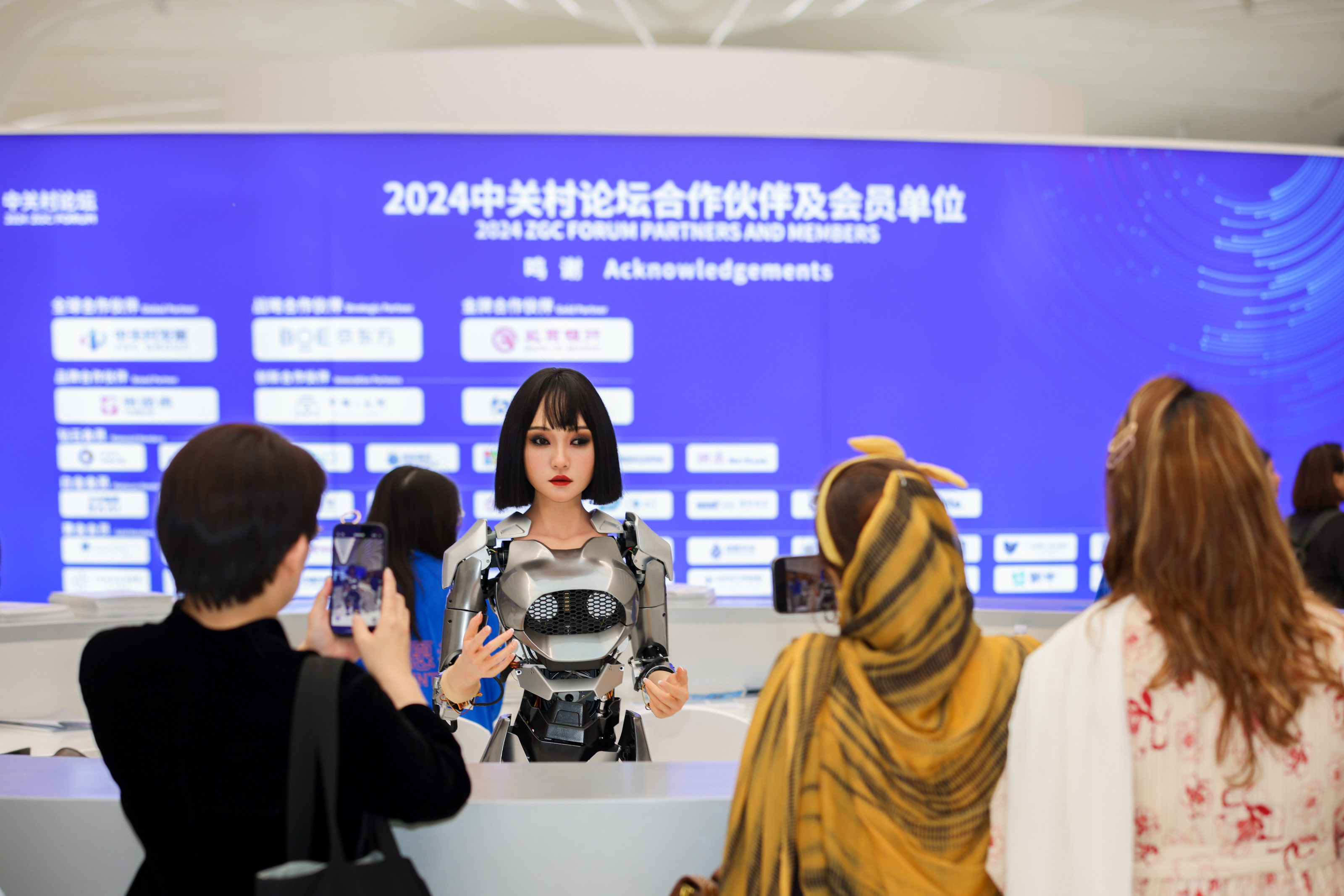 4月25日,2024中关村论坛年会会场内的仿生人形机器人为参会嘉宾提供咨询服务。中新社
