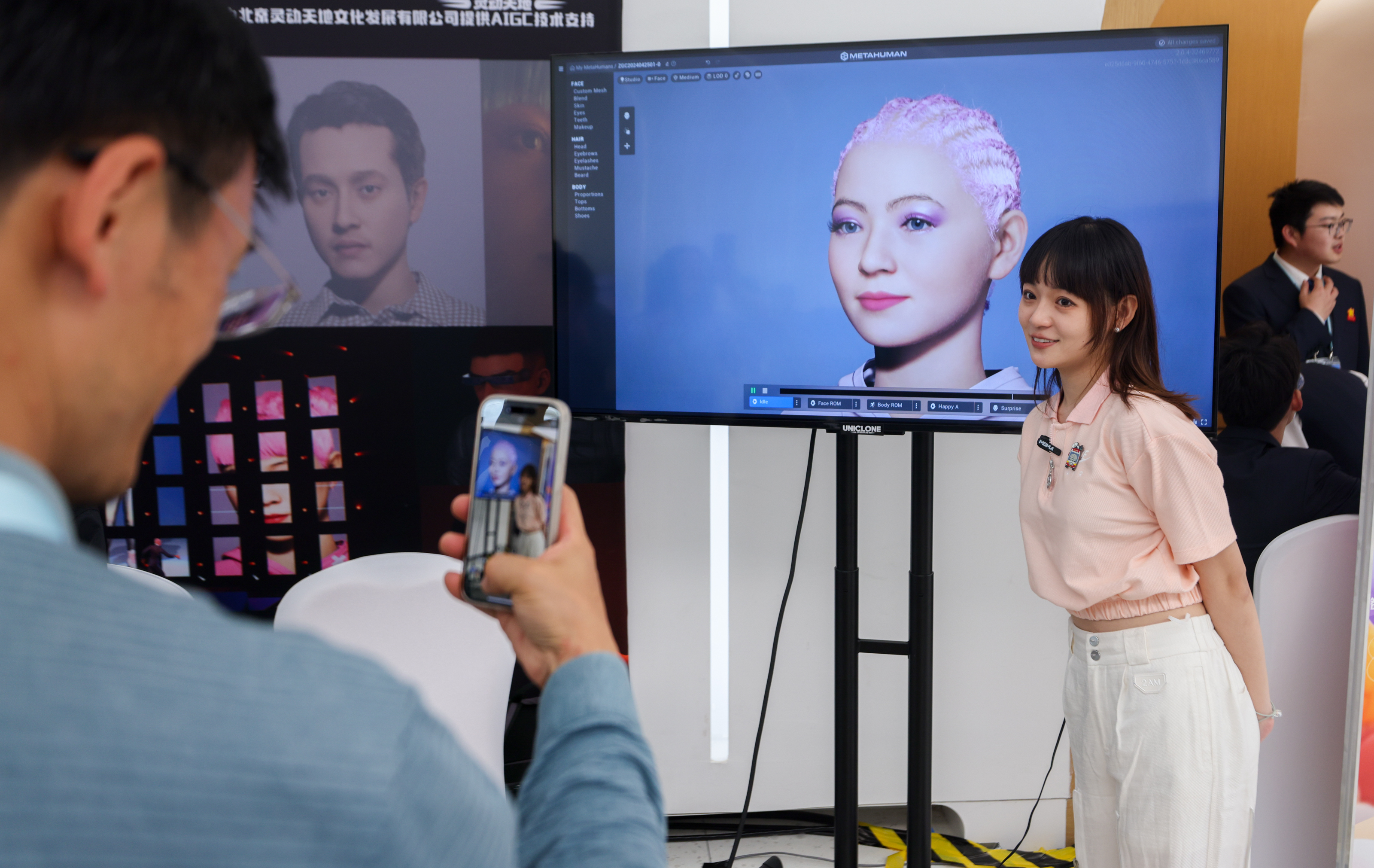 4月25日,2024中关村论坛年会在位于北京的中关村国际创新中心开幕。图为参会嘉宾与用自己的面部特征生成的AI数字人合影。中新社