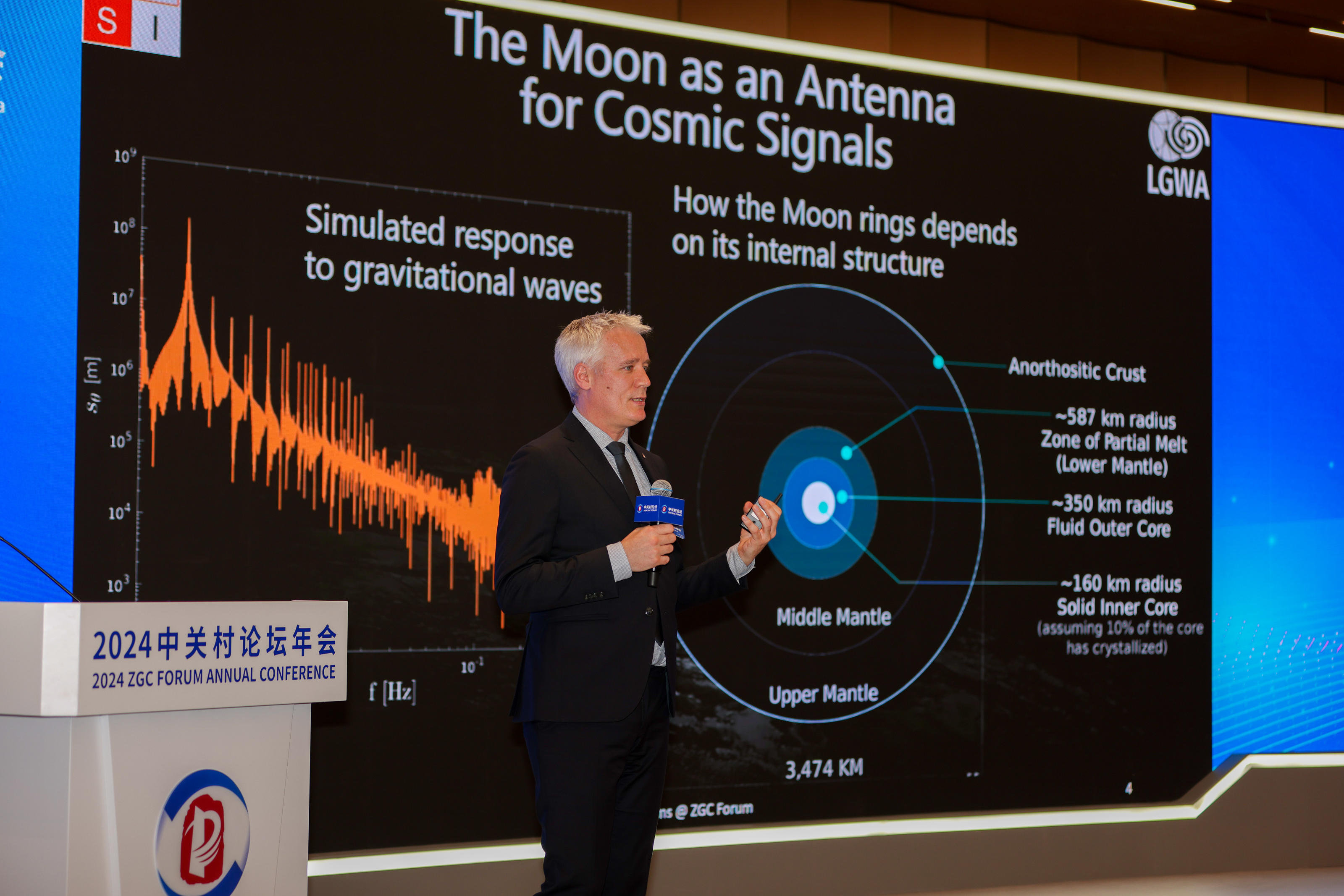 4月25日,2024中关村论坛的平行论坛之一——基础研究促进可持续发展国际论坛在北京举行。图为意大利格兰萨索科学研究院教授、月球引力波天线国际合作组织LGWA总协调员扬·哈姆斯(Jan Harms) 做题为《月球引力波探测》的专题报告。中新社