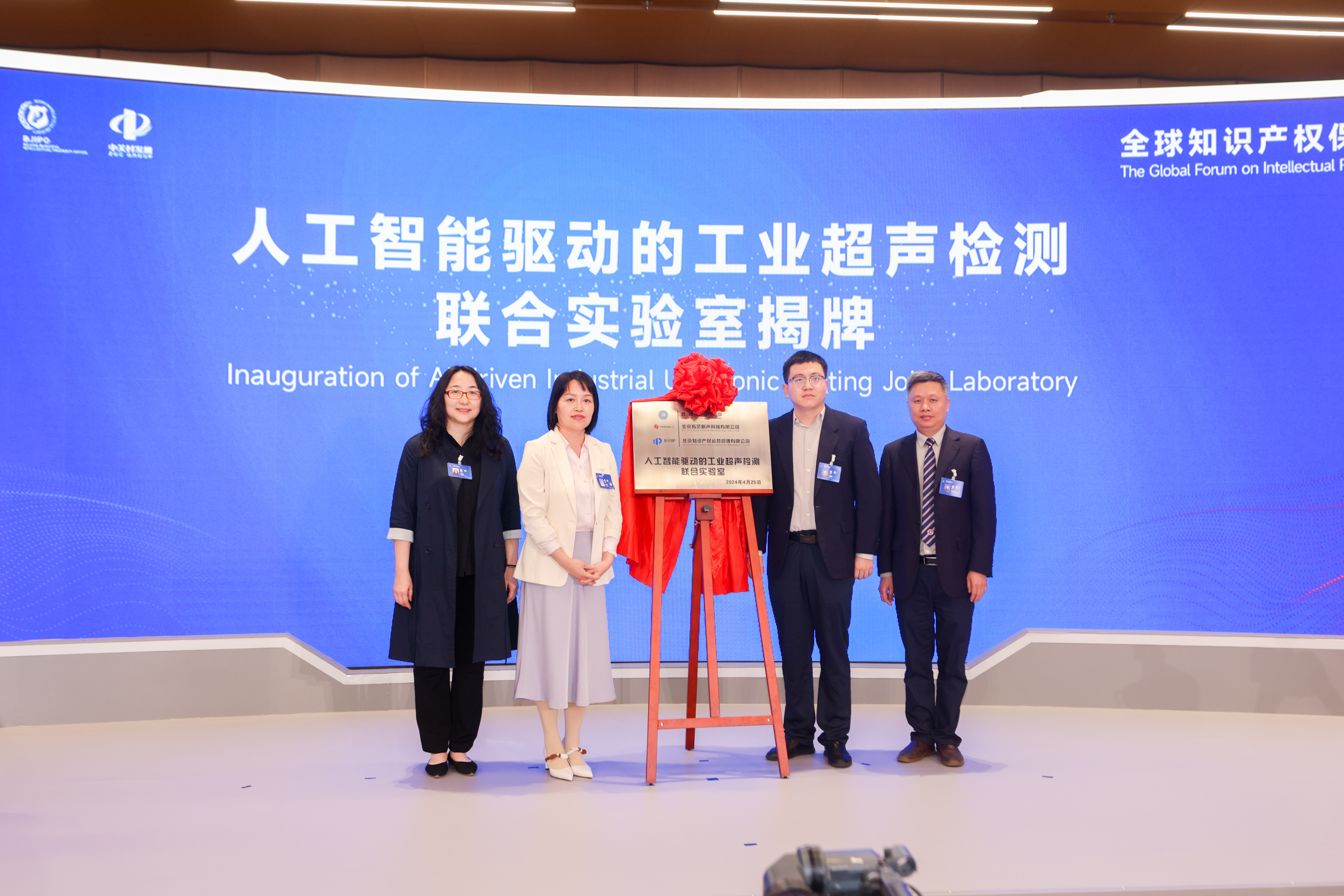 4月25日,以“创新:建设更加美好的世界”为主题的2024中关村论坛年会在位于北京市海淀区的中关村国际创新中心开幕。年会设置论坛会议、技术交易、成果发布、前沿大赛、配套活动五大板块。围绕人工智能、空间科学、生命健康、碳达峰碳中和、未来产业等科技前沿和热点议题,邀请全球知名专家学者、企业家、学术组织代表线上线下相聚,交流思想观点,共商创新大计。当日,2024中关村论坛的平行论坛之一——全球知识产权保护与创新论坛在北京举行。图为论坛上举行的人工智能驱动的工业超声检测联合实验室揭牌仪式。中新社