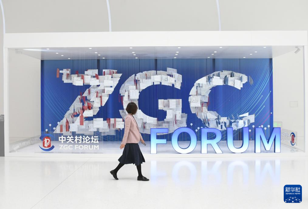 4月25日,在中关村国际创新中心,一名女子从中关村论坛标识前走过。新华社