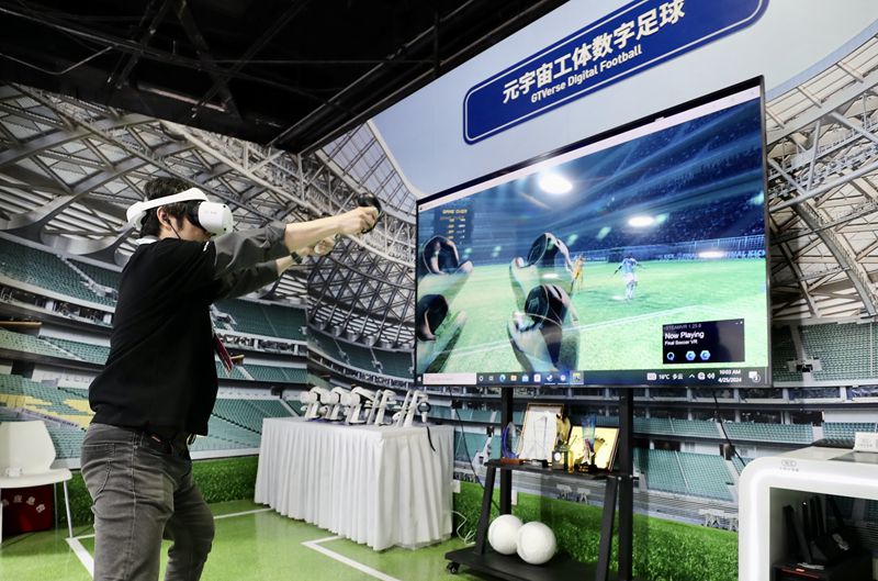 4月25日,一名嘉宾体验元宇宙工体数字足球。中国日报网
