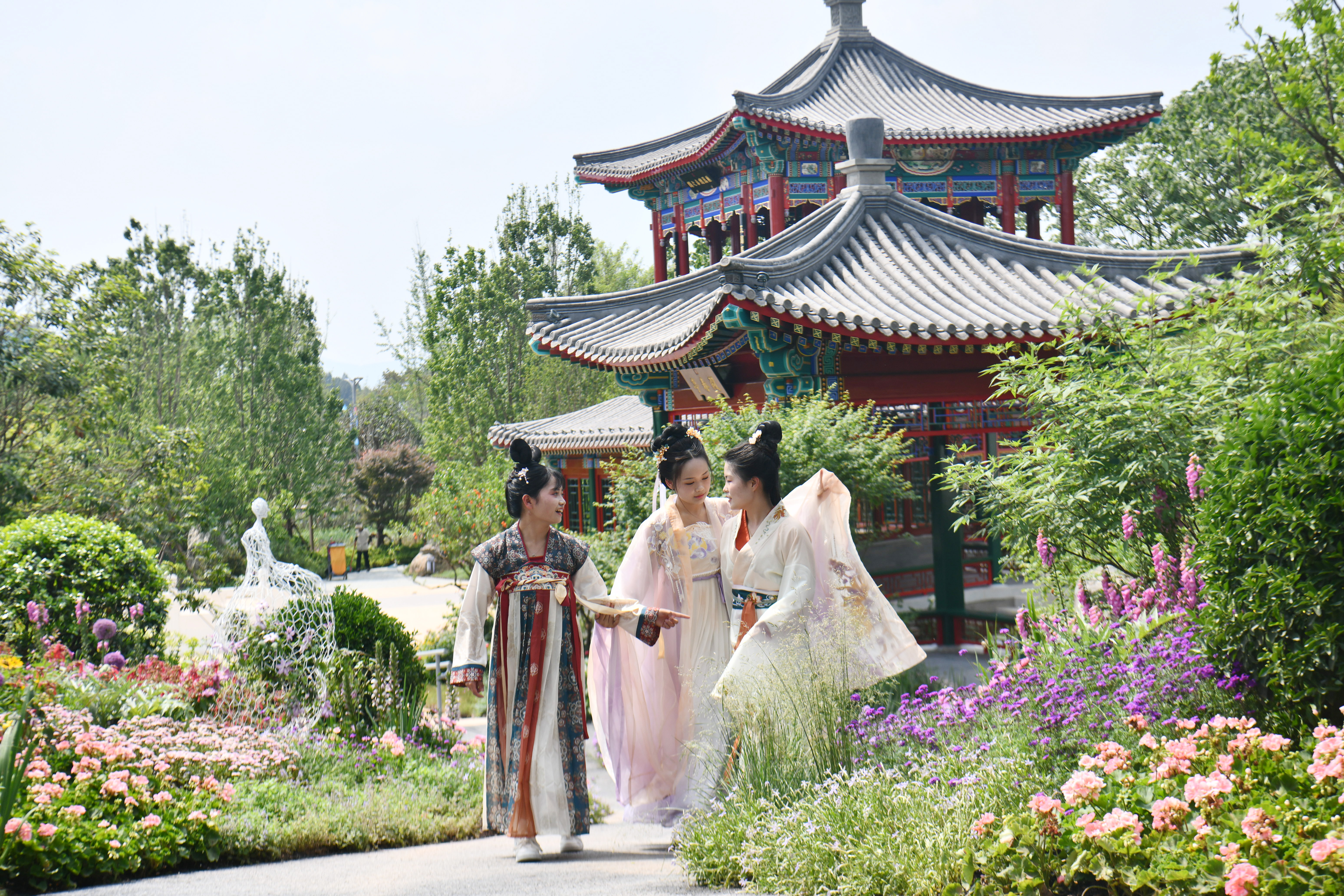 参观者身着古装在北京园参观拍照。中新社