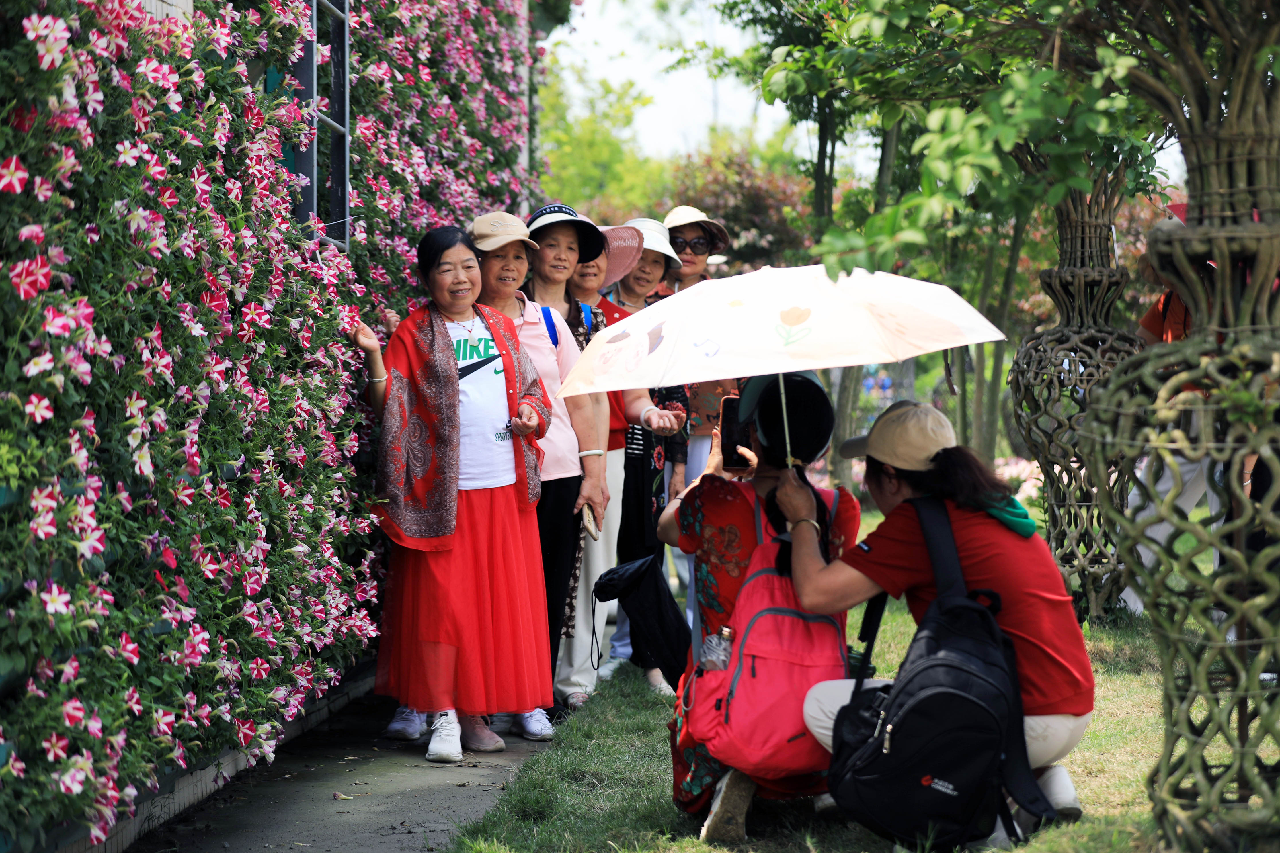 参观者在园区内的花墙前拍照留影。中新社