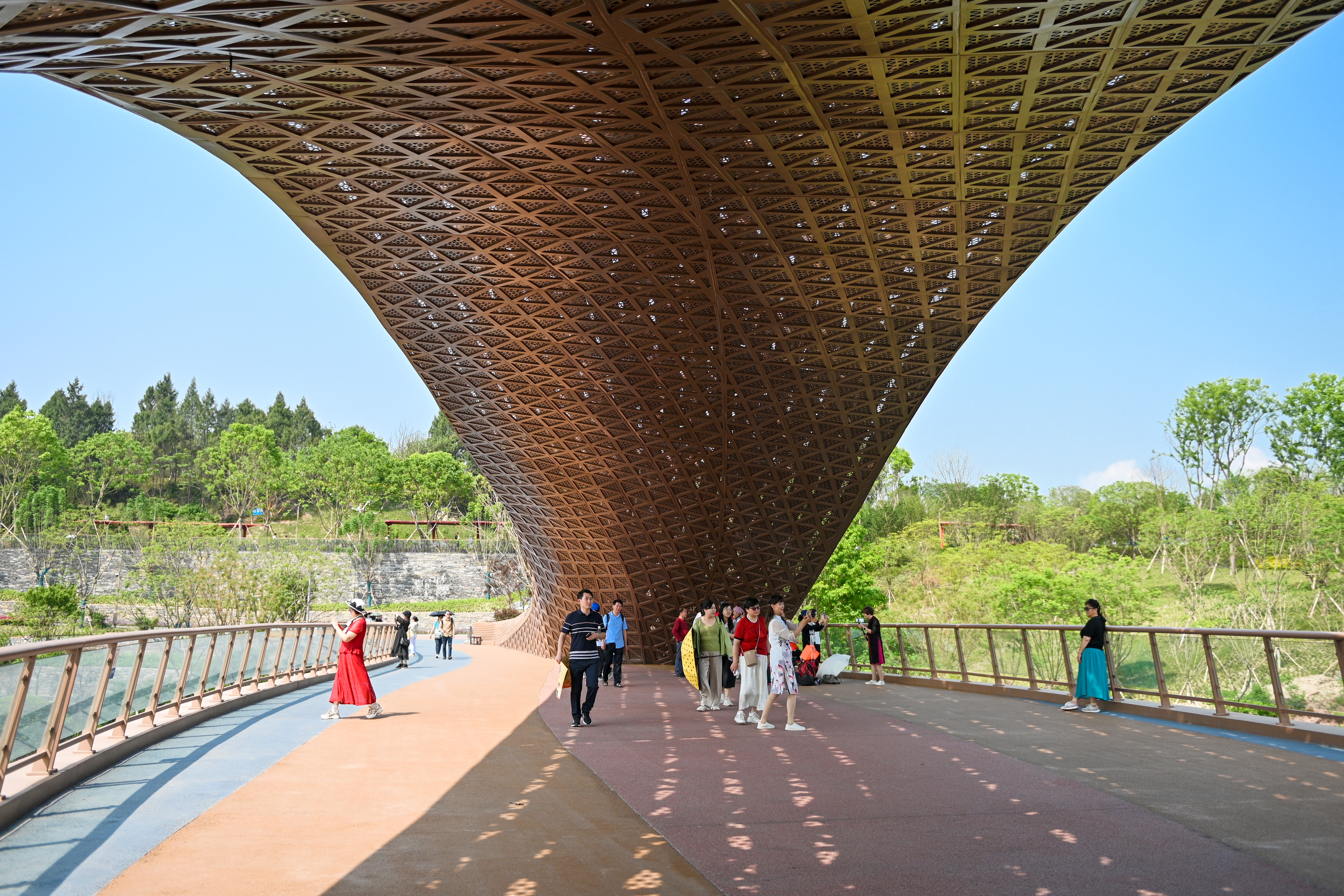 参观者行走在成都世园会“竹编桥”上。中新社