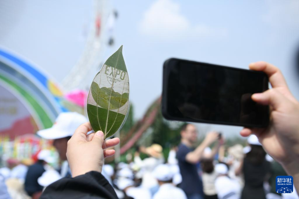 4月26日开幕式现场,观众手持纪念品拍照。新华社