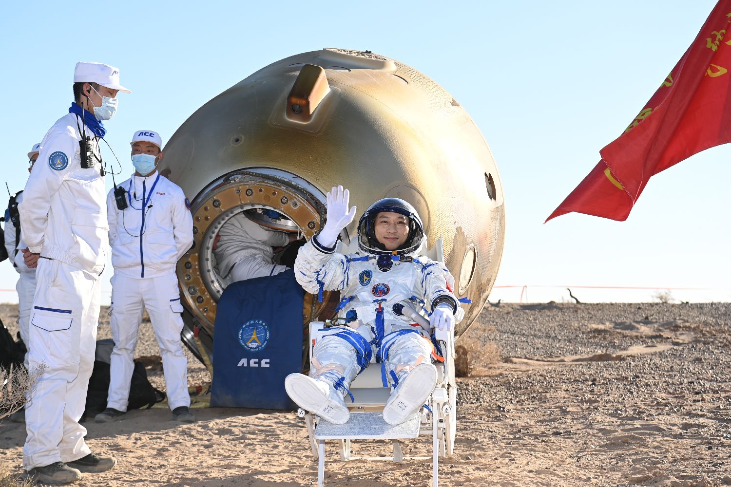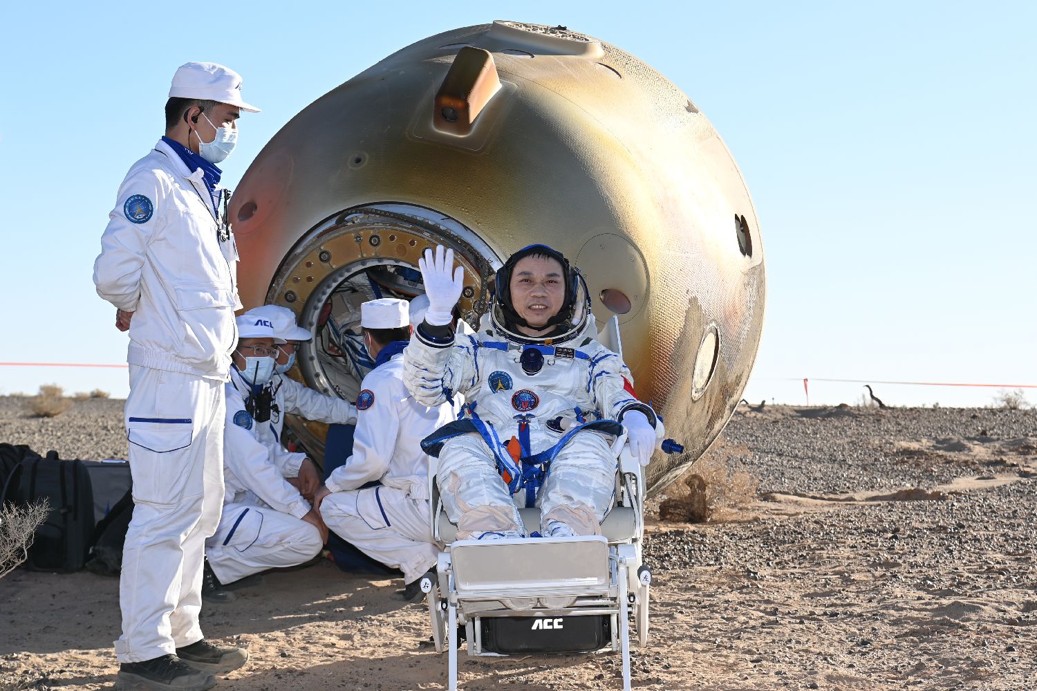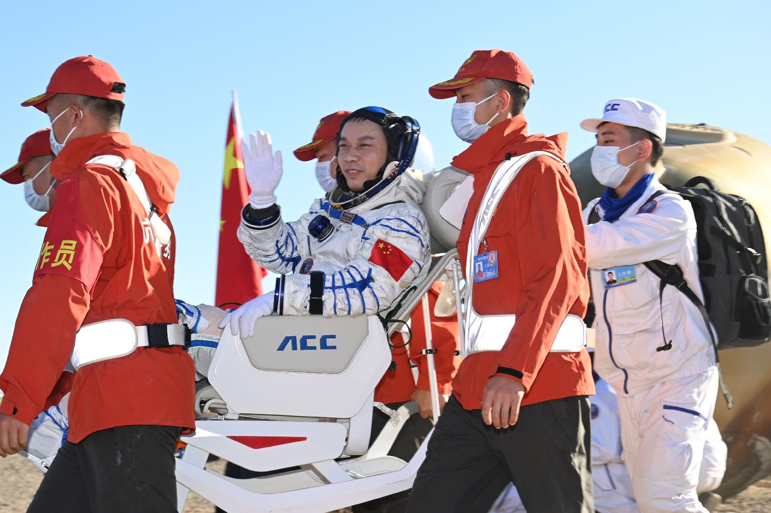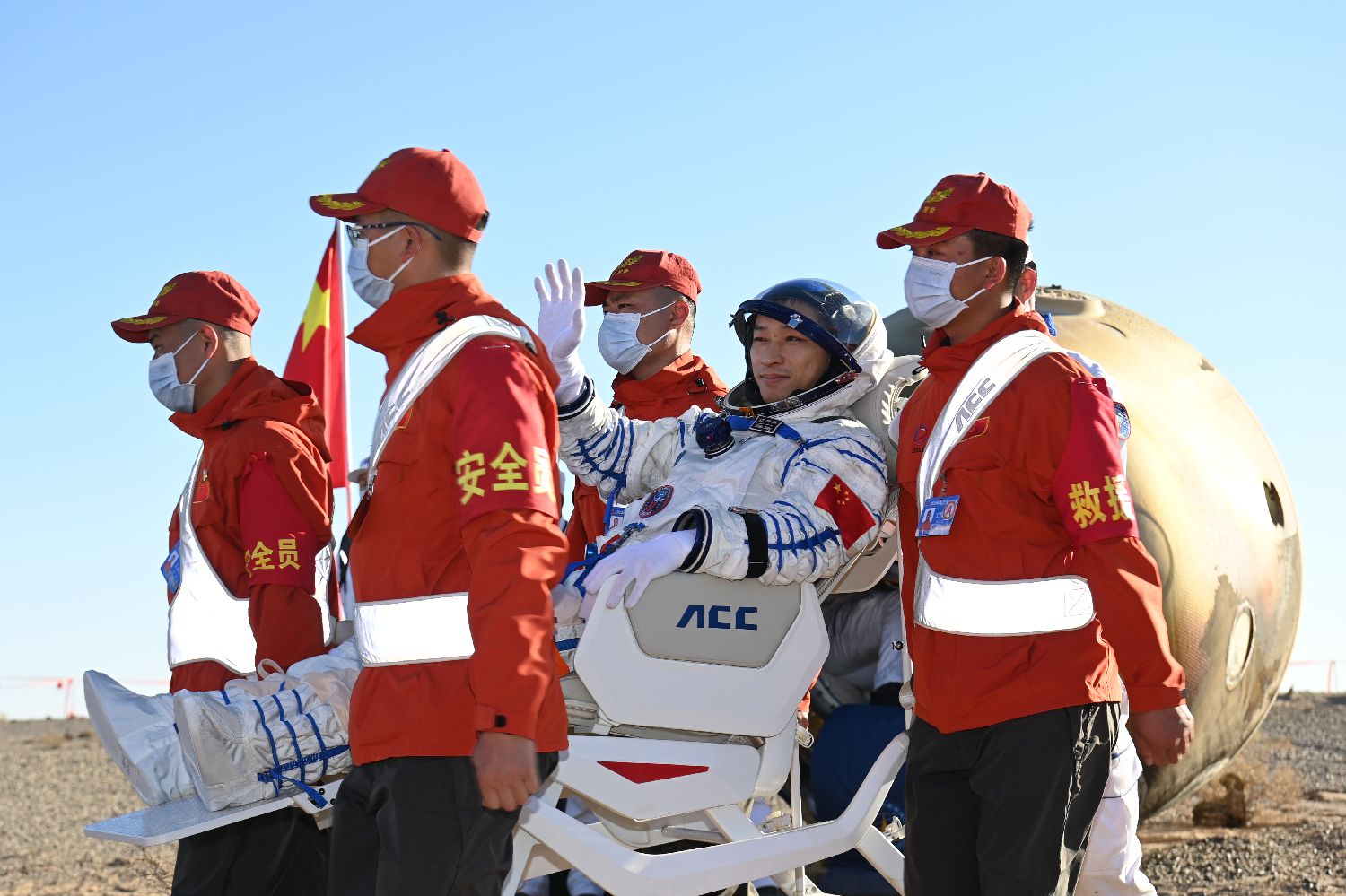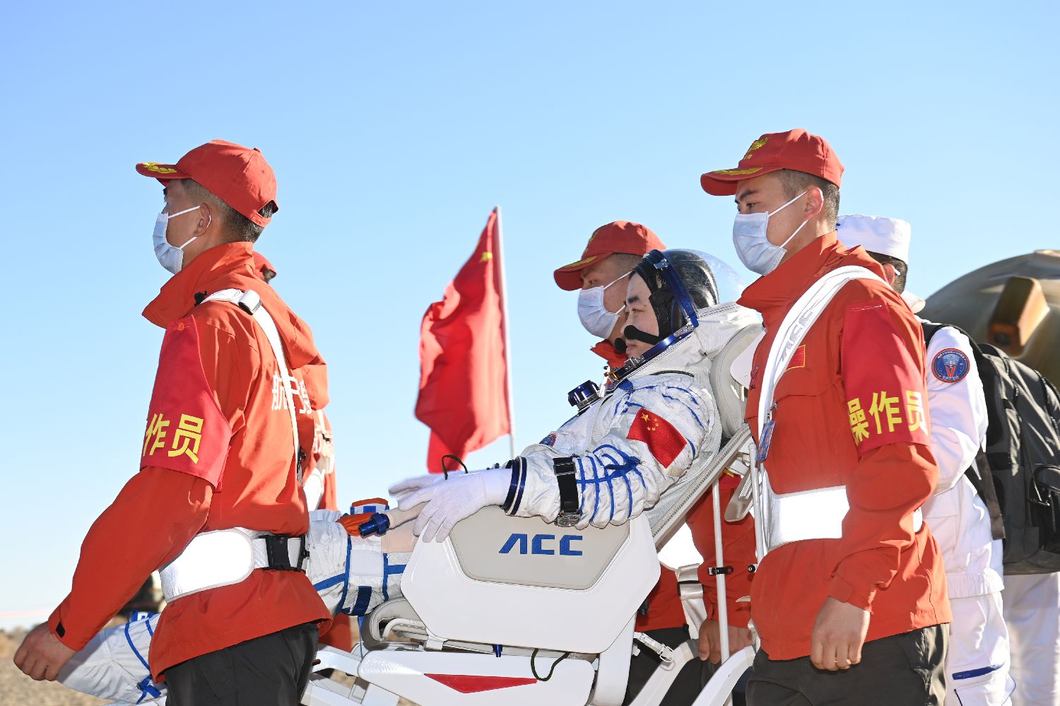 4月30日17时46分,神舟十七号载人飞船返回舱在东风着陆场成功着陆,现场医监医保人员确认航天员汤洪波、唐胜杰、江新林身体状态良好,神舟十七号载人飞行任务取得圆满成功。 至此,航天员汤洪波重返“天宫”的圆梦征程完美收官,航天员唐胜杰、江新林的首飞之旅圆满完成。从首次进驻中国人自己的空间站到2年零1个月后重返“天宫”,汤洪波刷新中国航天员在轨飞行时间最长纪录。图为神舟十七号航天员汤洪波安全顺利出舱。