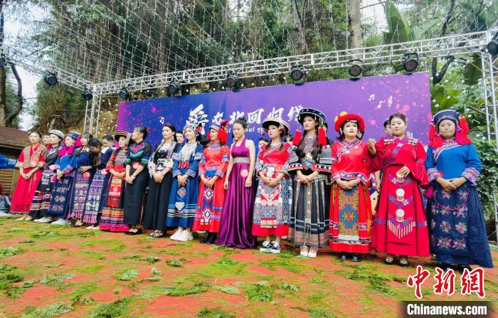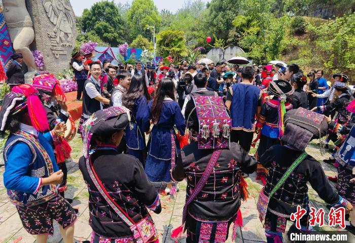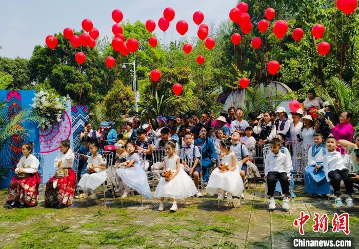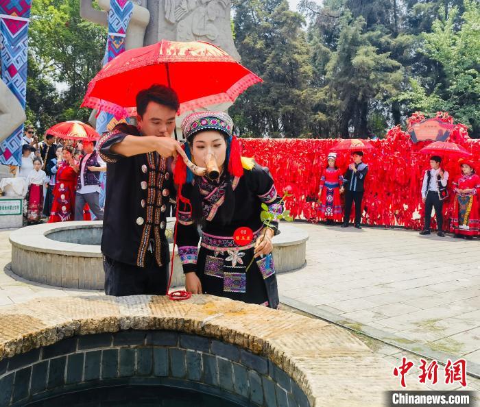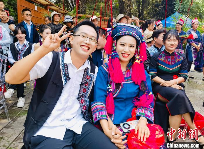 5月1日,在第十八届墨江北回归线国际双胞胎节暨哈尼太阳节举办期间,16对新人走进云南省普洱市墨江哈尼族自治县北回线标志园,喝双胞水、睡双胞床,载歌载舞,一起举办一场哈尼族婚礼。现场,多对双胞现身迎亲队伍为新人送祝福。图为穿哈尼族服装的一对新人。